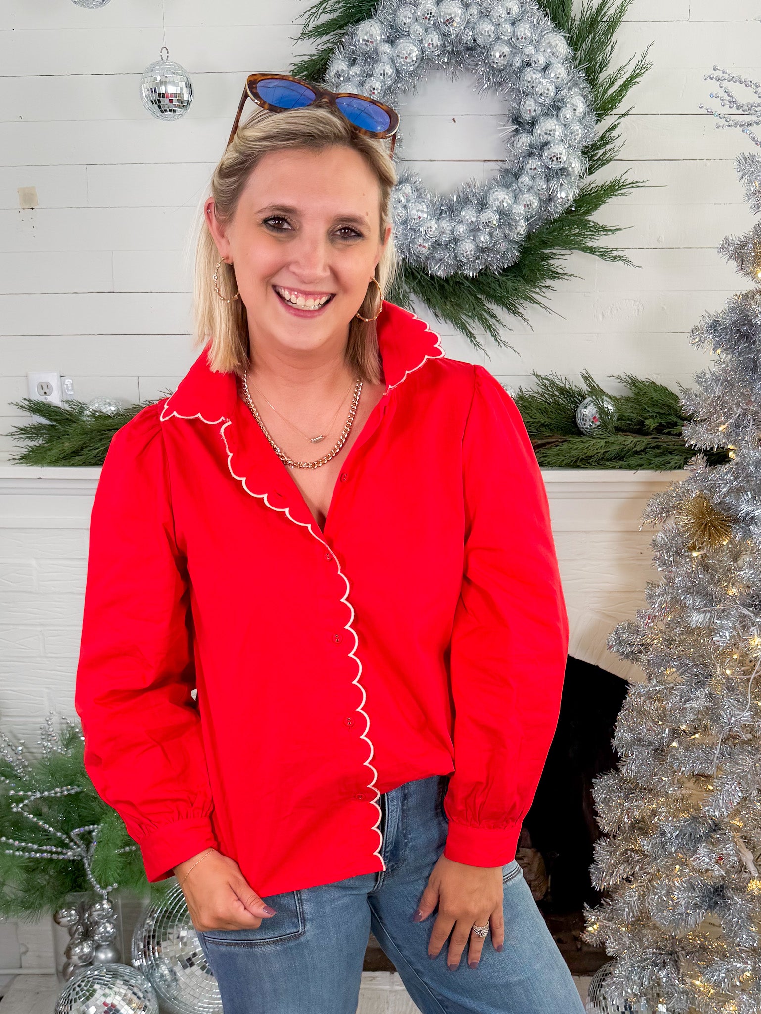 We love a chic blouse to carry from season to season! Our Benton Red Scallop Edge Top features gorgeous white scallop details along the front + collar, giving her that little something extra for your Holiday wardrobe! Benton is an easy option for everyday dressing, work-to-weekends, and all the festive gatherings on your social calendar! Pair Benton back with your favorite denim + flats for a casual look or glam her up with a festive plaid skirt + heels!