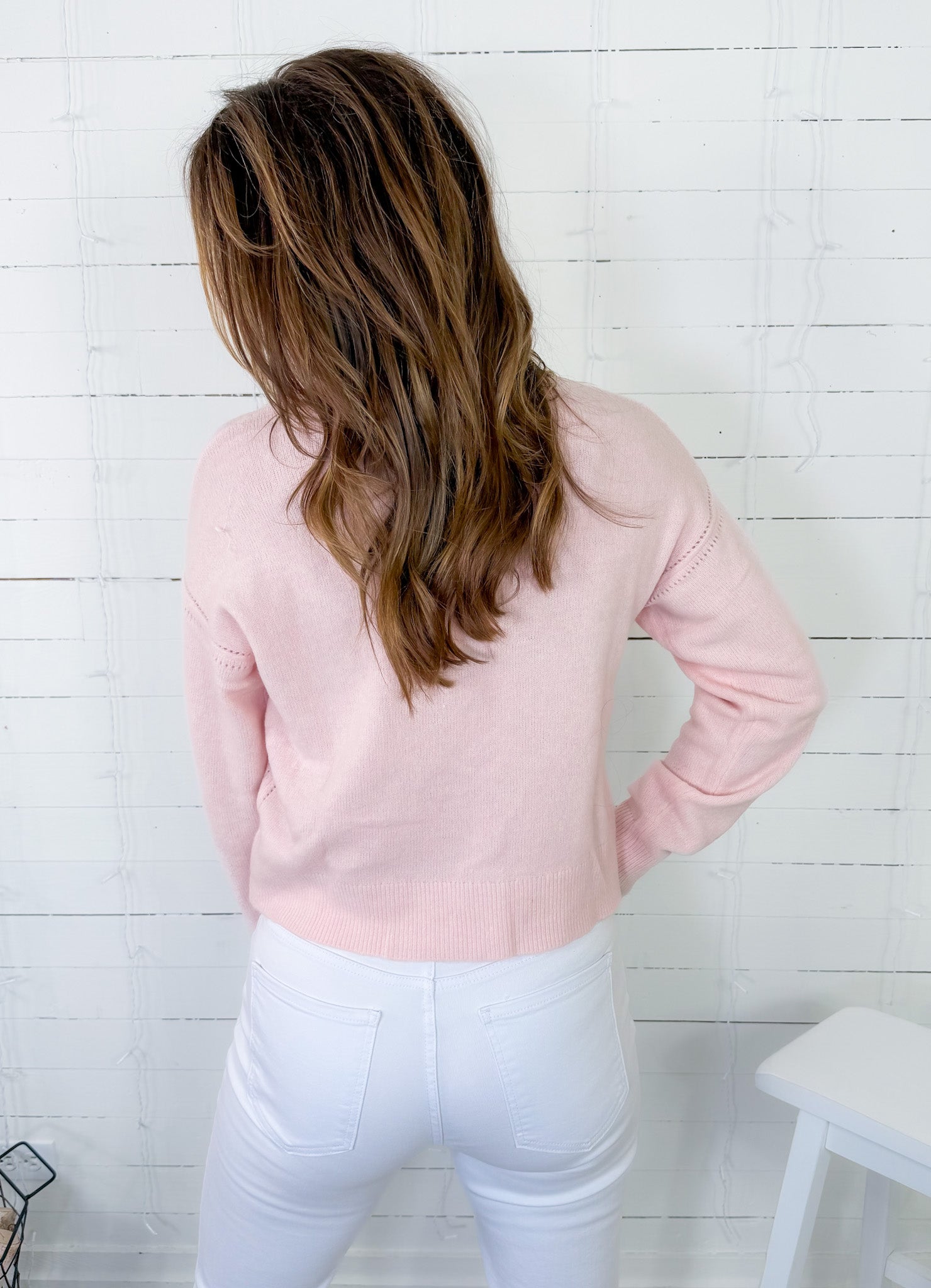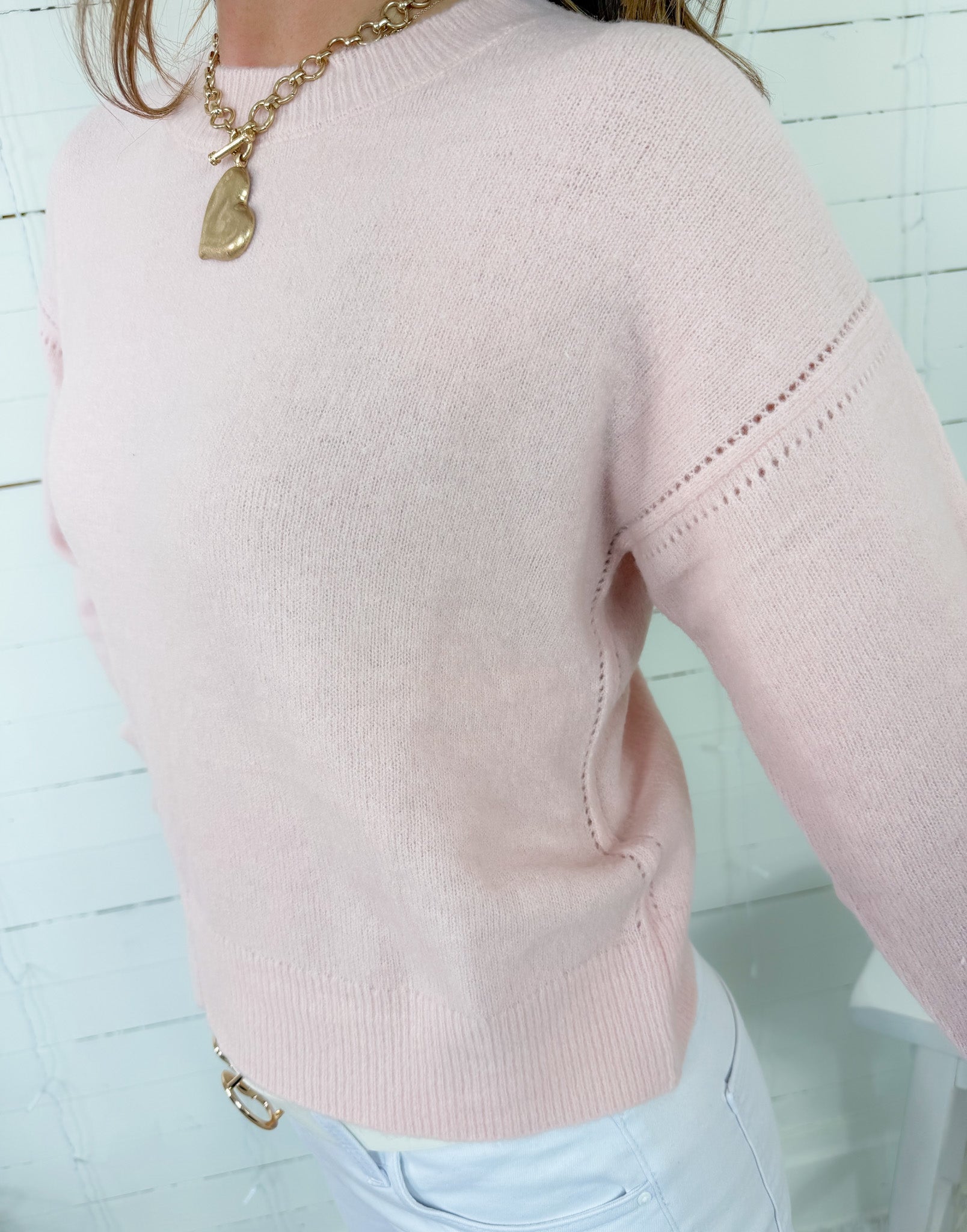 Our Blush Crewneck Boxy Sweater is a soft, everyday essential with subtle detail. Designed in a light blush pink, this sweater features a classic crew neckline, relaxed boxy fit, and delicate pointelle detailing along the sleeves for a polished touch. Lightweight and easy to wear, it’s perfect for layering or styling on its own with jeans, trousers, or skirts.