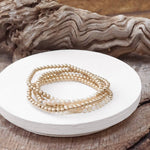 Perfect for layering with other pieces, the timeless and Boho classy design will effortlessly complement any outfit, making it the perfect addition to your accessory collection. Colorful bracelet stack of 4 bracelets in worn gold tone and color glass beads.