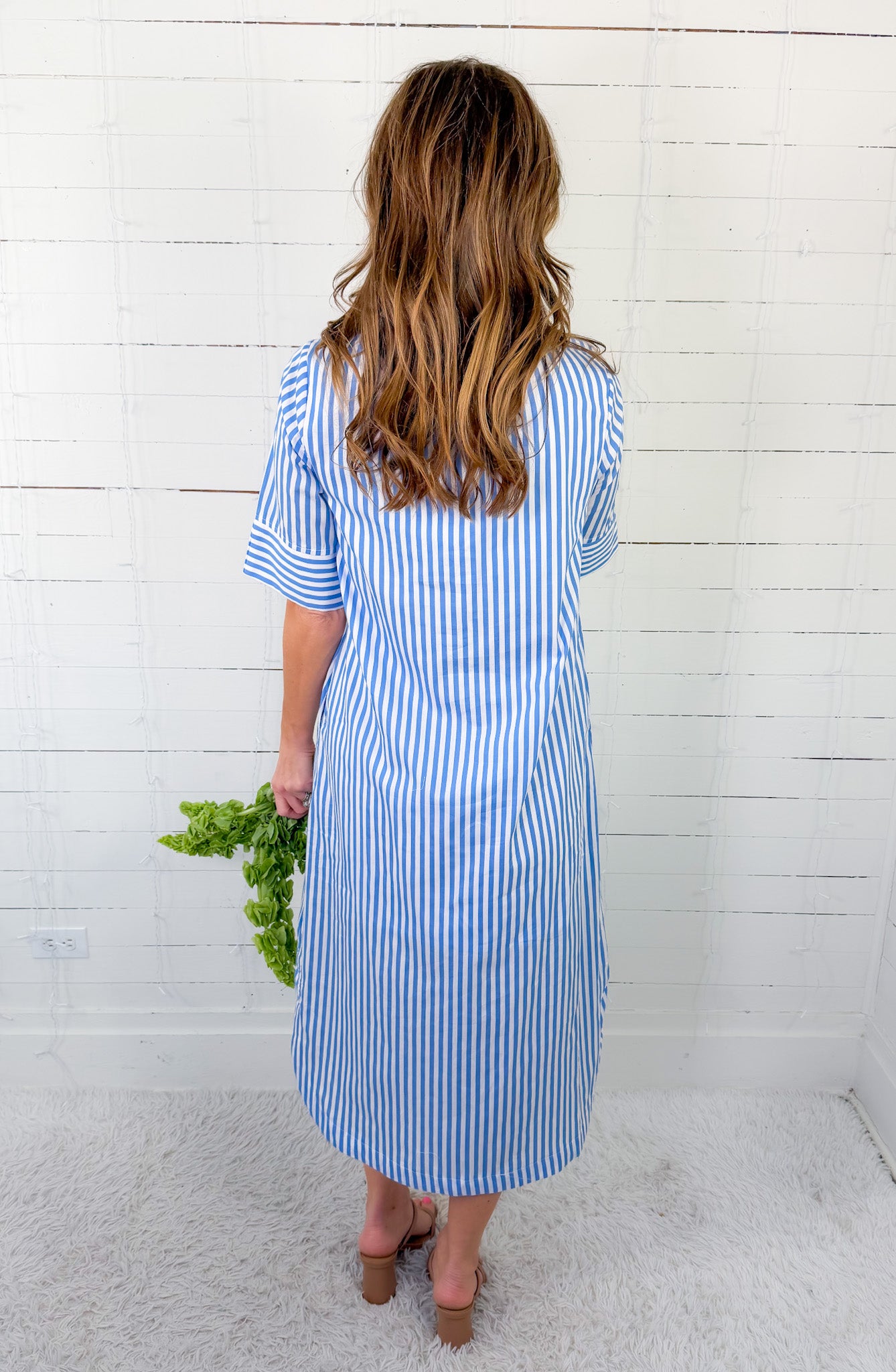 Pretty in pinstripes! Our Cabana Blue Stripe Maxi Dress is the kind of dress that instantly makes getting dressed feel easy! Her crisp blue-and-white stripe brings a fresh, polished look while her tailored details keep things timeless + wearable! This gorgeous shirt dress features a ruffled collar neckline with a button down style, short cuffed sleeves, and a relaxed fit to bring you ease + movement! Whether you’re heading to brunch, the office, or a Spring event, Cabana will always have you feeling put-together without trying too hard!
