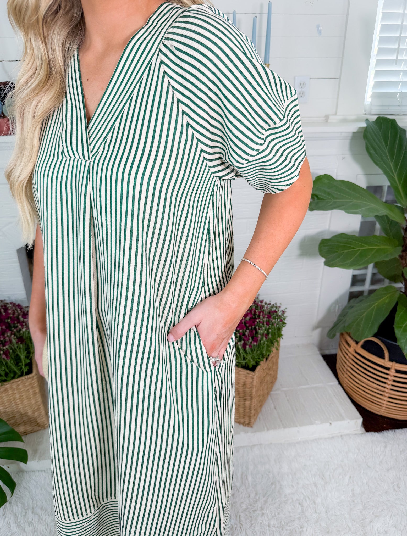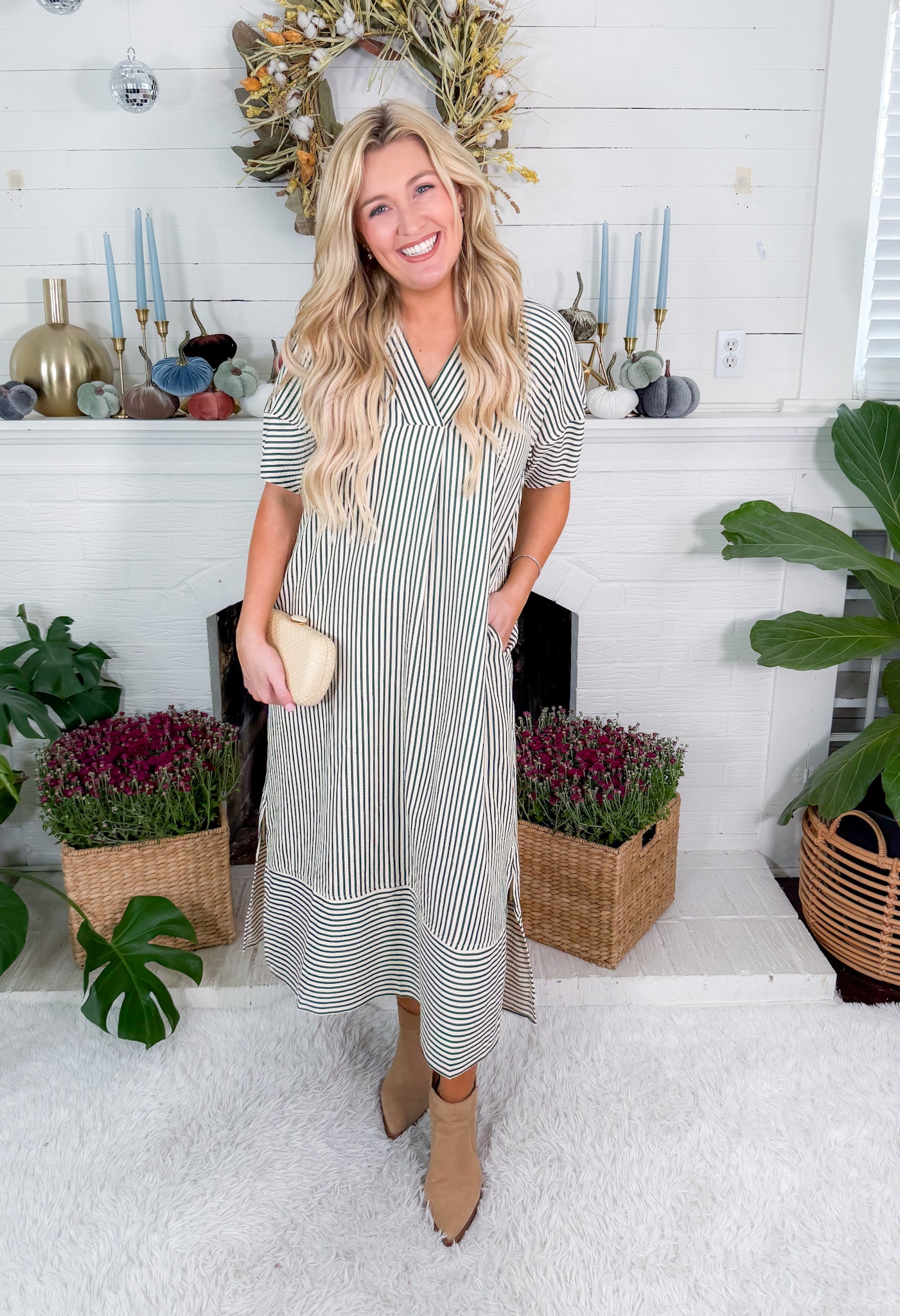 We had her this Summer + you SOLD HER OUT instantly! And now she's back again, prepared to add herself to your Fall wardrobe in every color! Our Carson Hunter Green Striped V-Neck Maxi Dress is crafted from a hunter green + ivory seersucker fabric, offering a classic + preppy look our customers LOVE! Featuring short sleeves with contrast stripe banding, a v-neckline, pockets and a relaxed silhouette that is sure to turn her into your GO-TO piece every day this Fall! Carson pairs beautifully with sneakers, slides or booties to best fit your Fall style guide - just add jewels + your chic personality to complete your look with her!