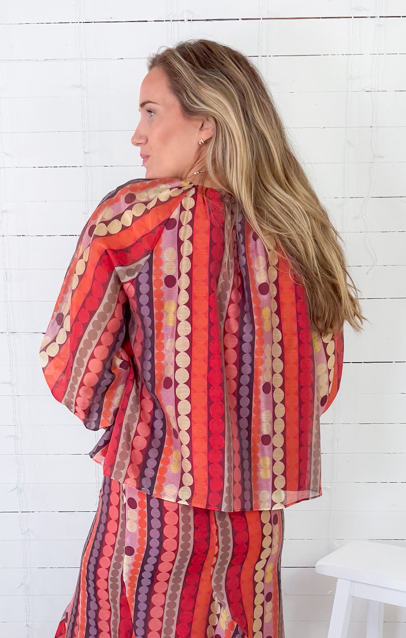 Meet the blouse that instantly elevates your everyday wardrobe. Our Rileigh Red Multi Striped Blouse features a rich, eye-catching mix of reds, pinks, and warm neutrals in a modern stripe pattern that feels both playful and polished. Designed with a relaxed, drapey silhouette, this blouse offers easy elegance without feeling fussy. The soft, lightweight fabric flows beautifully, while the gathered neckline and subtle volume through the sleeves add a feminine touch. Wear it tucked or untucked, styled casually with denim or paired with the matching Riley Red Multi Flounce Maxi Skirt for a statement-making set that feels effortlessly put together. This is one of those pieces that does the styling work for you — bold enough to stand alone, versatile enough to wear on repeat.