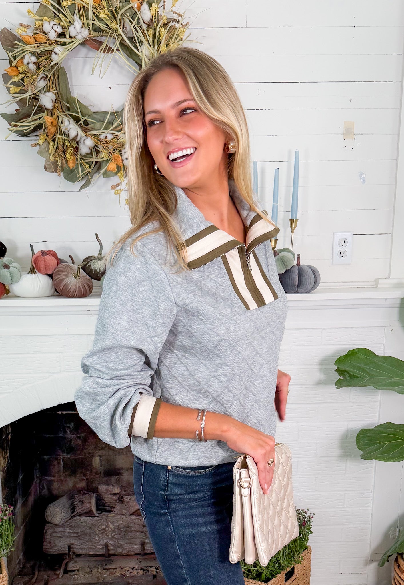 Our Collier Gray Quilted Top is your new cuddle-me-comfy favorite for the Fall season! She is a playful pop-over featuring long sleeves, quilted cozy material, and a relaxed fit that's perfect for those easy style days! Her zippy striped contrast around the quarter zip adds just the right splash of fun—because even your coziest pieces deserve a little personality!