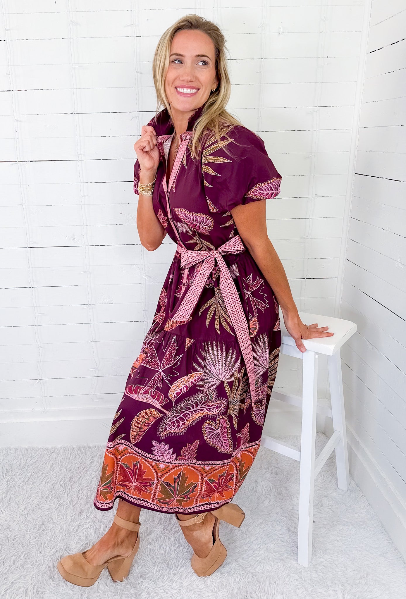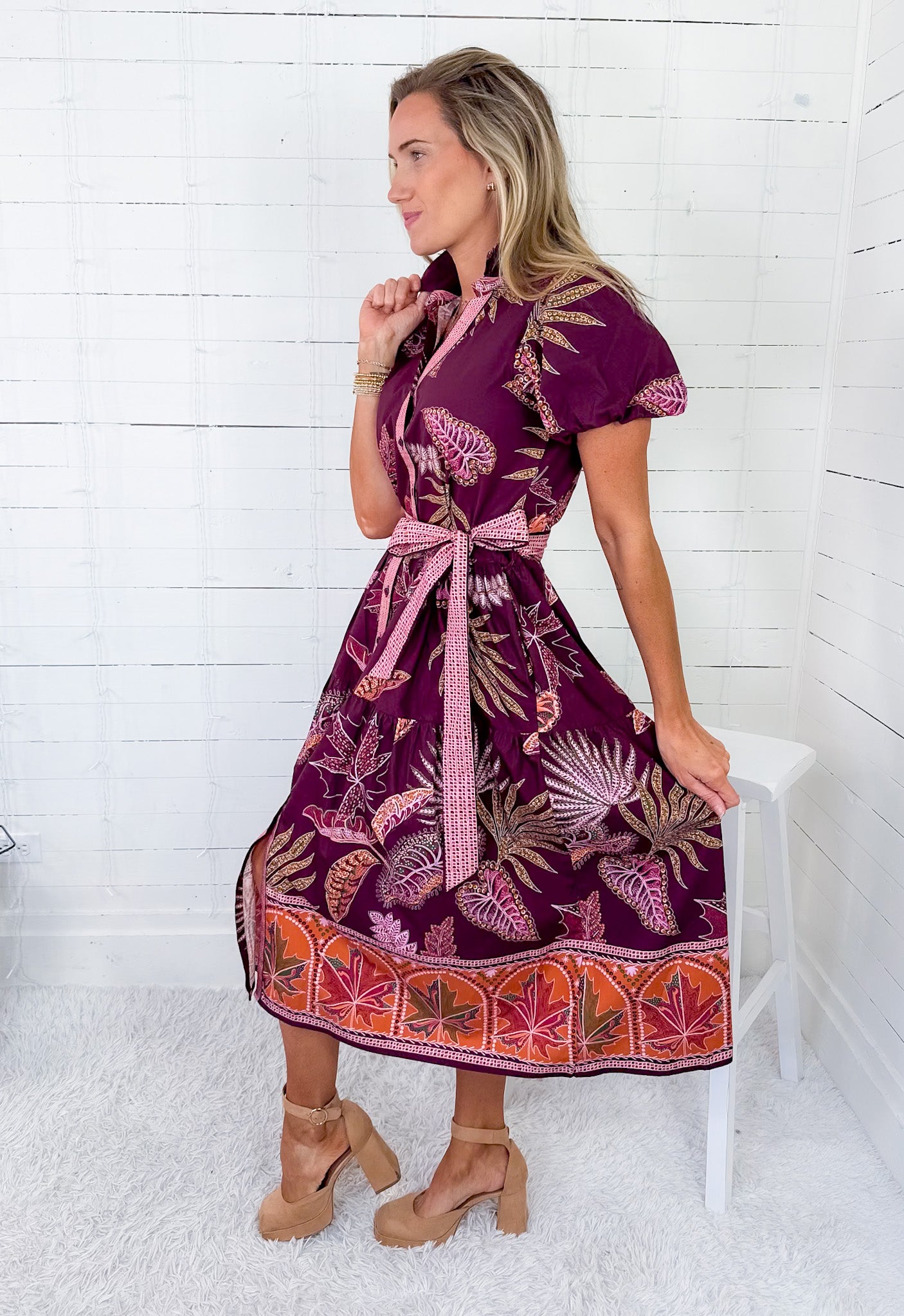 The Della Wine Floral Midi Dress is a standout silhouette with timeless charm. Designed in a rich berry hue with an intricate paisley print, this dress features a crisp poplin fabric, short puff sleeves, and a classic button-front style. The adjustable self-tie belt cinches the waist beautifully, creating a flattering, feminine shape. Dress it up with heels for special occasions or keep it easy with flats for daytime—this is one of those pieces that feels both elevated and effortless.