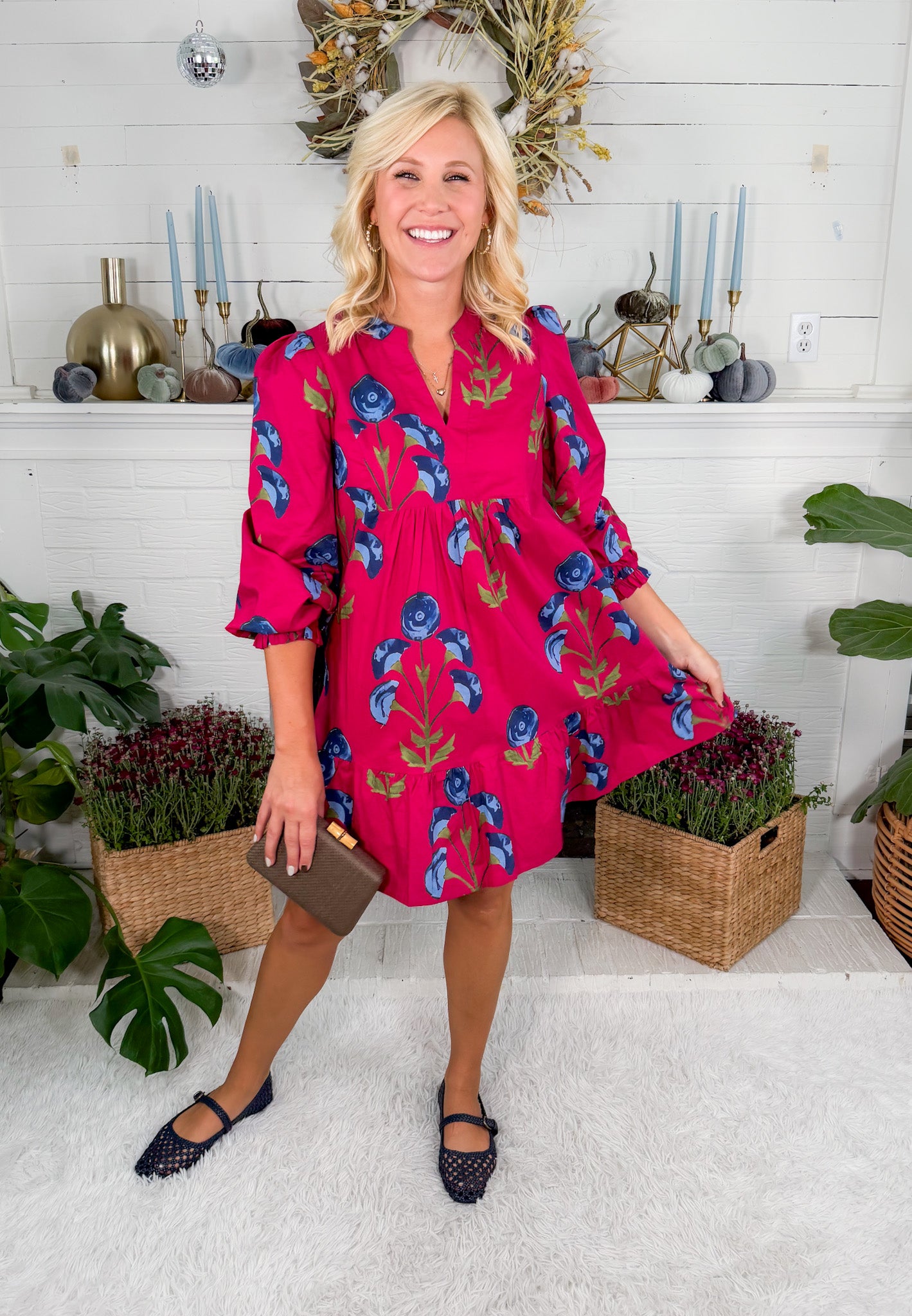 Our Drew Berry Mini Dress is effortlessly cute for the Fall season! Her blue on blue tone flowers dance across her burgundy fabric, creating a fresh, feminine look every time! Designed with a flowy silhouette, Drew offers a cling-free fit, while her v-neckline + long ruffled sleeves finish her beautiful design! Drew is the perfect dress for now + later, pairing seamlessly with boots or trendy ballet flats!