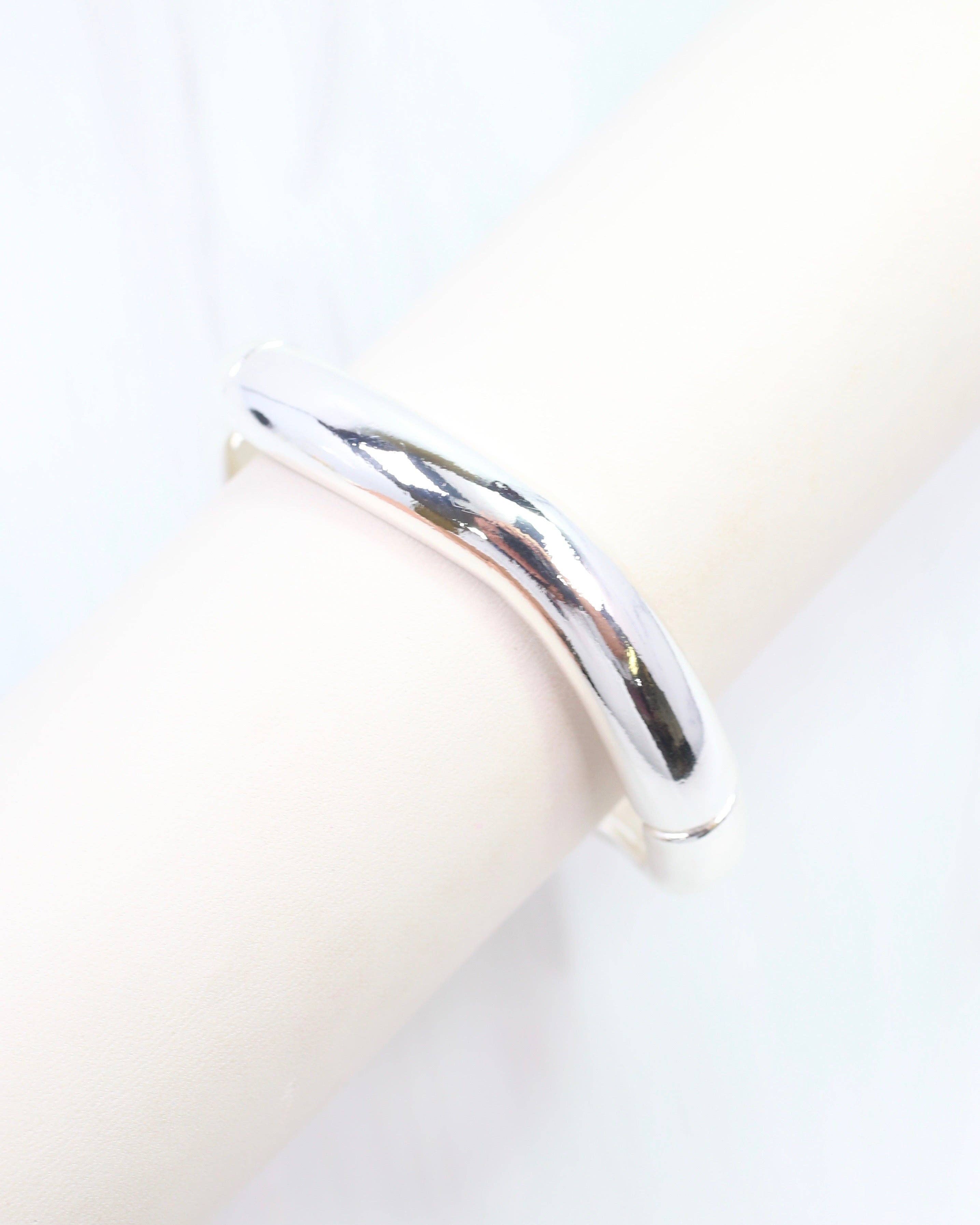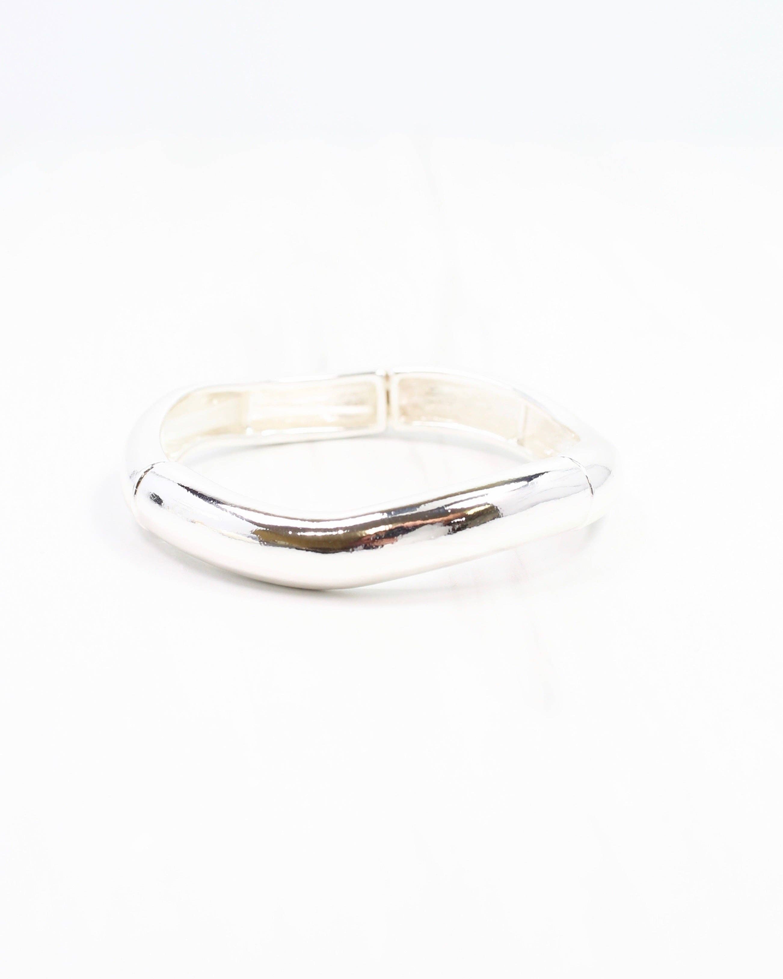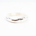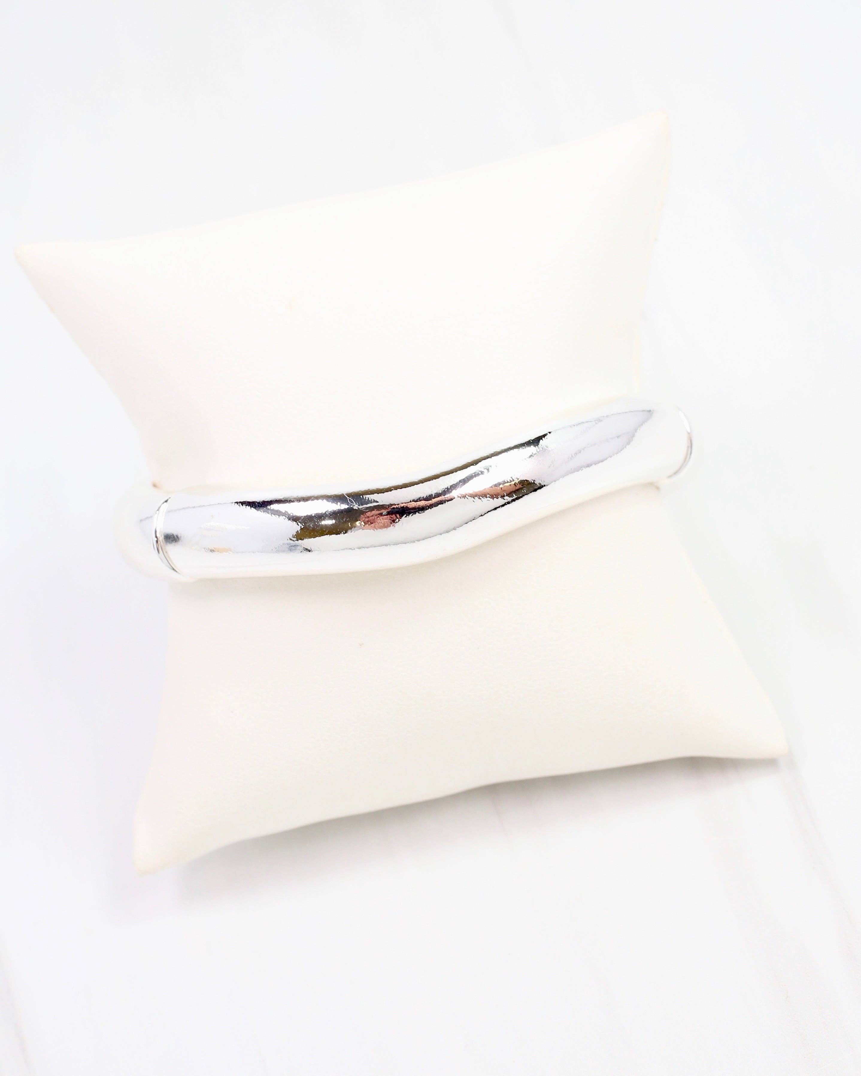 This Eastwood Bangle Bracelet in silver features a wavy, shiny design with a comfortable stretch fit. Its sleek, reflective surface adds a subtle sparkle to any outfit. The flexible stretch ensures a secure yet gentle fit, supporting your style with effortless elegance.