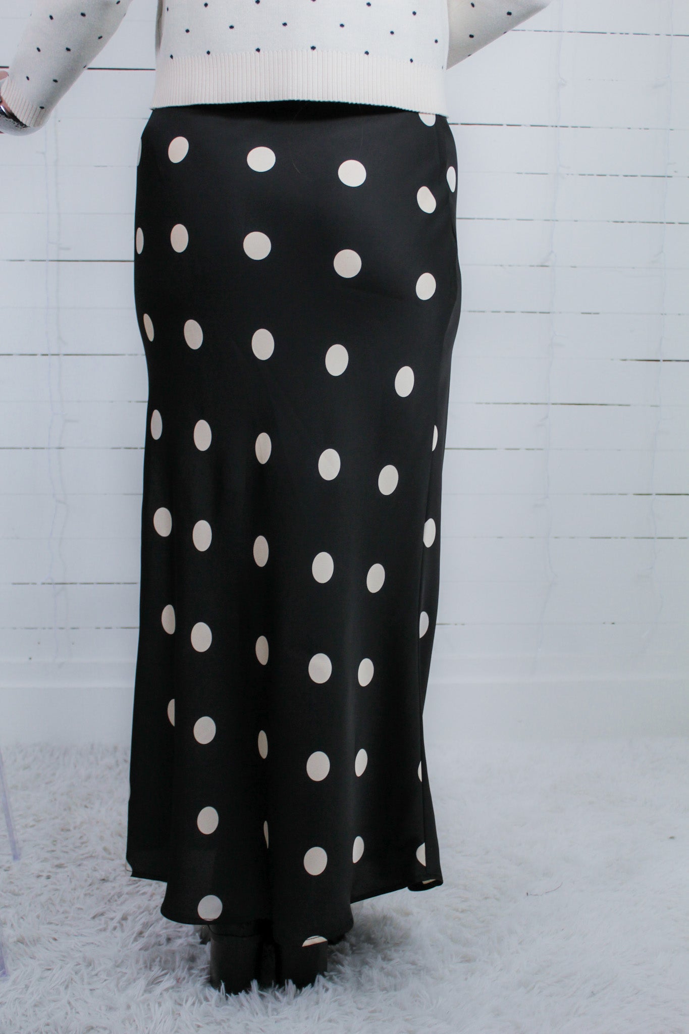 Achieve effortless style with our charming NEW skirt for the season - the Edward Black + Cream Polka Dot Slip Skirt! She features a classic ivory polka dot pattern against a black background, giving both timeless + playful style! Easily dress Edward up with heels + glitzy accessories, or dress her down with a simple ivory sweater tank + a denim jacket!