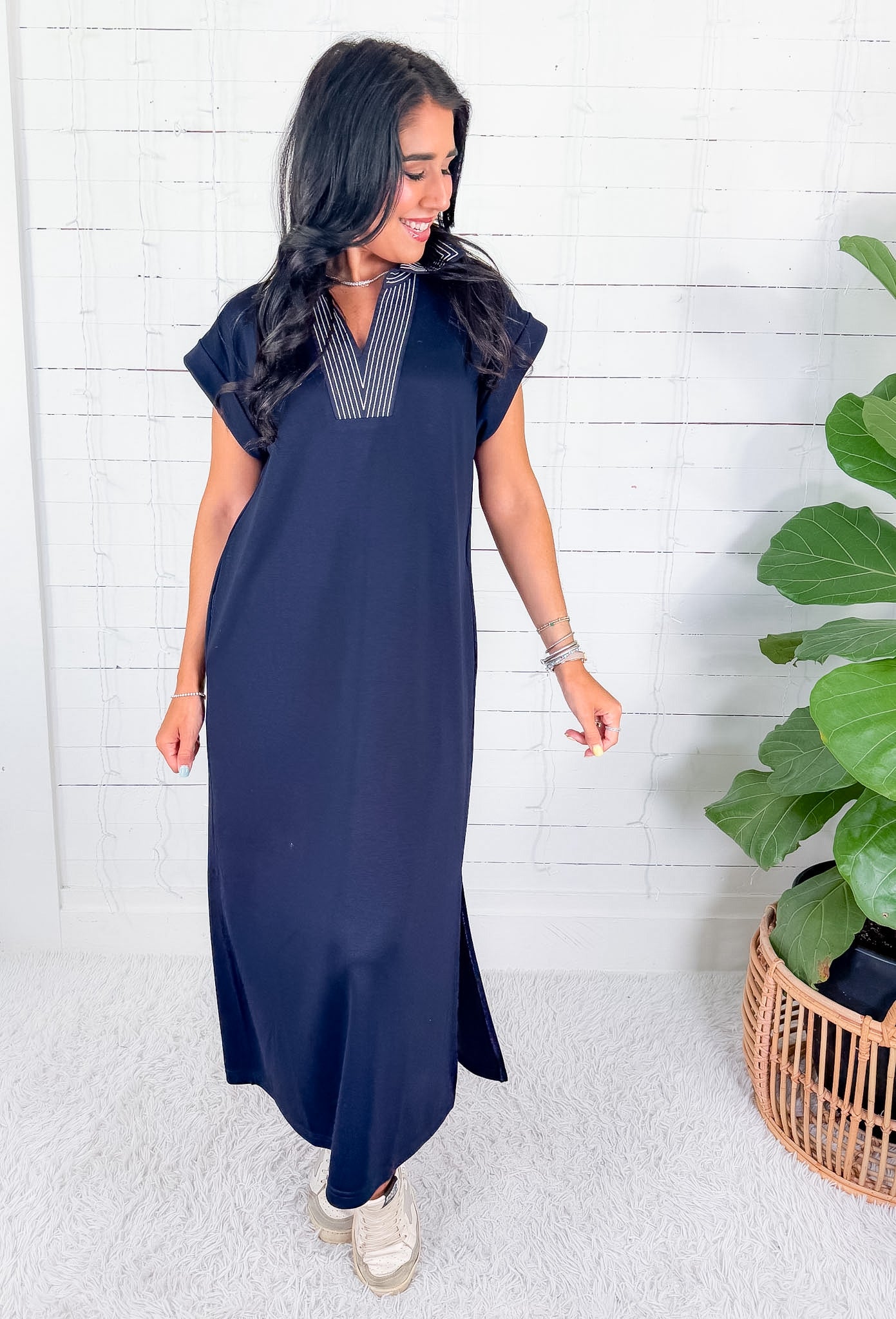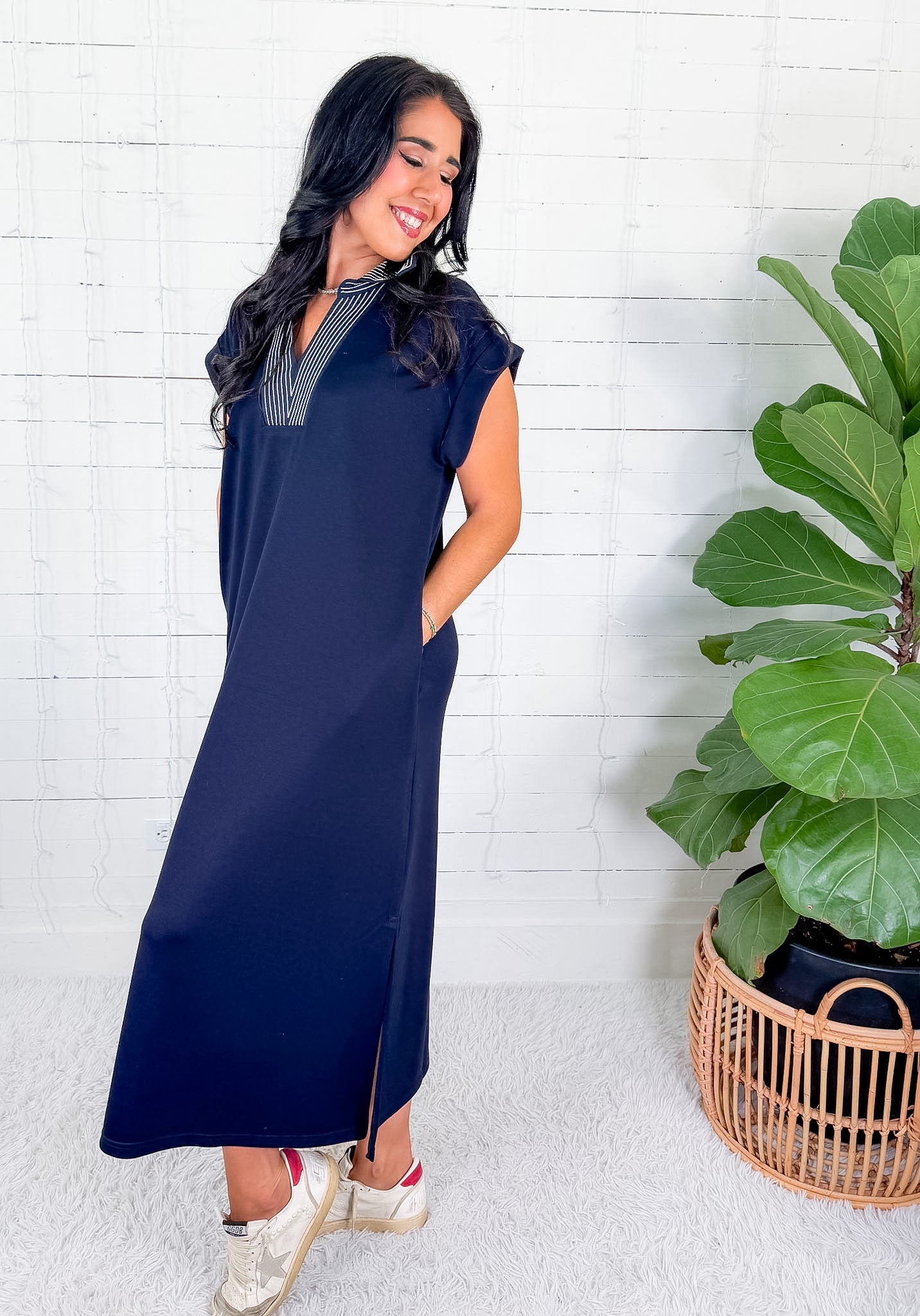 Elevate your everyday style this Americana season with our Ellie Navy Knit Maxi Dress! She's made from a soft, easy-to-wear knit + has contrast stitching along the collar +neckline, bringing your every day look up a notch! Perfect for warmer days, Ellie pairs effortlessly with flats or sandals for a chic, laid-back look that is sure to become your favorite this season!