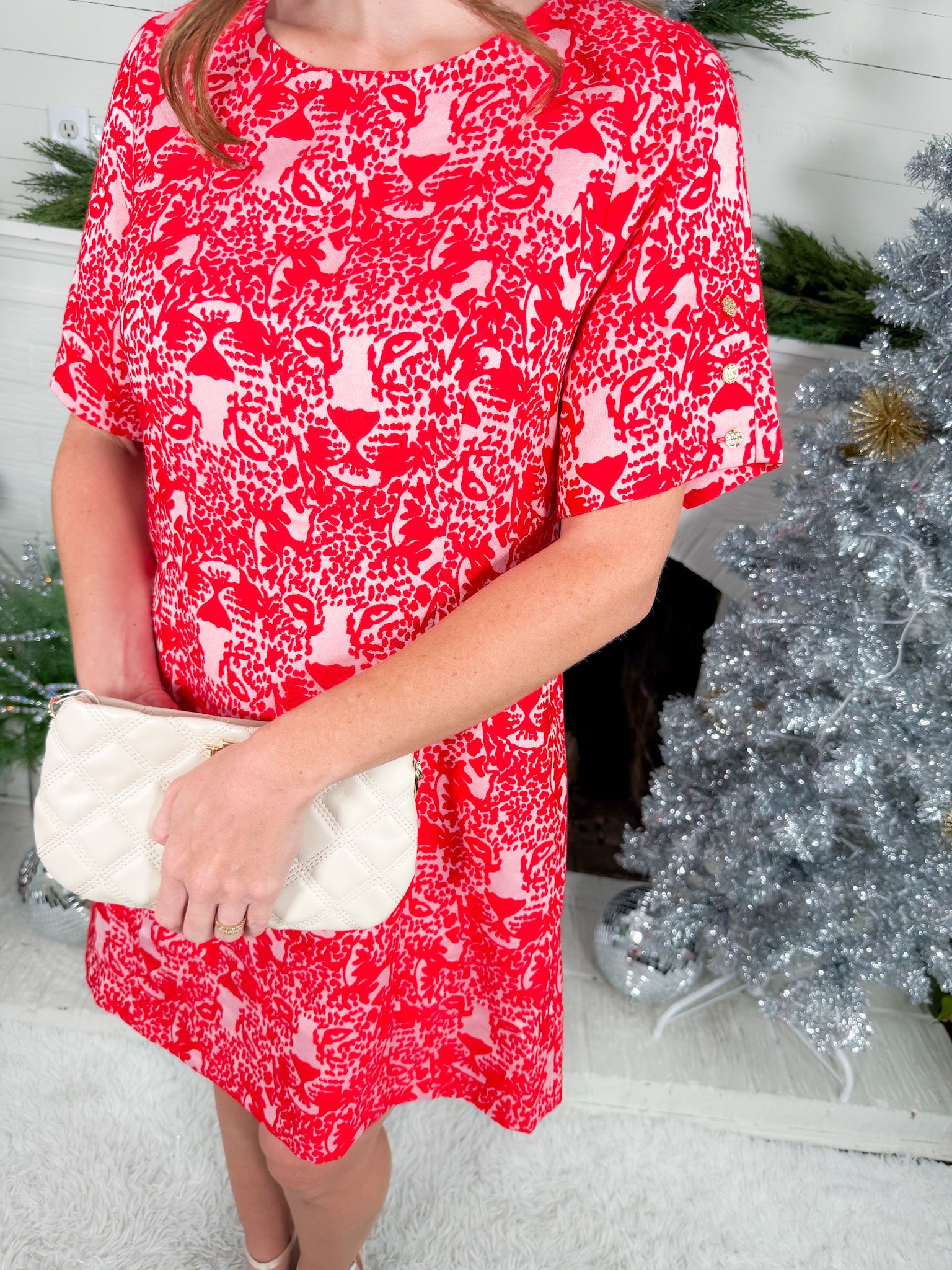 Such a cheeky little cheetah dress for the Holiday season! Our Emily McCarthy Royale Shift Cheeky Cheetah Mini Dress is a classic shift dress reimagined with a playful pink-and-red design featuring unexpected cheetah faces! She is designed with a crew neckline, short sleeves with gold button detail, and flattering princess seams, offering a tailored yet loosely structured silhouette! This beauty is an easy everyday shape with an elevated twist, perfect for making a statement in comfort all Holiday season long!