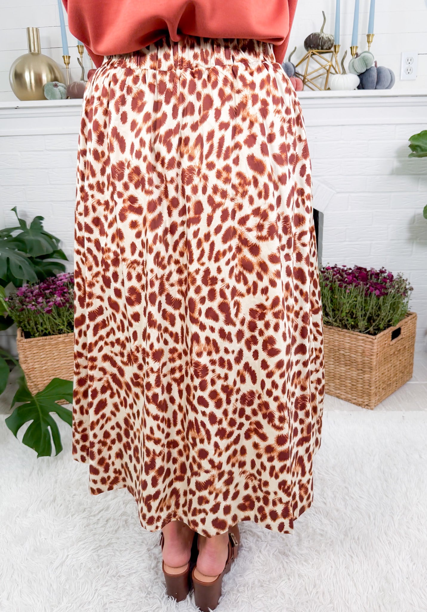 Our Erica Untamed Midi Skirt brings fierce energy + a touch of chic elegance to your Fall wardrobe! Breezy + full of personality, Erica’s perfect for a day at the office, lunch dates, or any moment when you want your style to feel a little "untamed"! Erica features a beautiful animal print throughout, elastic back waist insert, full white lining, flowy skirt, and functional pockets! Add a chic autumn hue top + booties to really feel ALL FALL with this beauty!