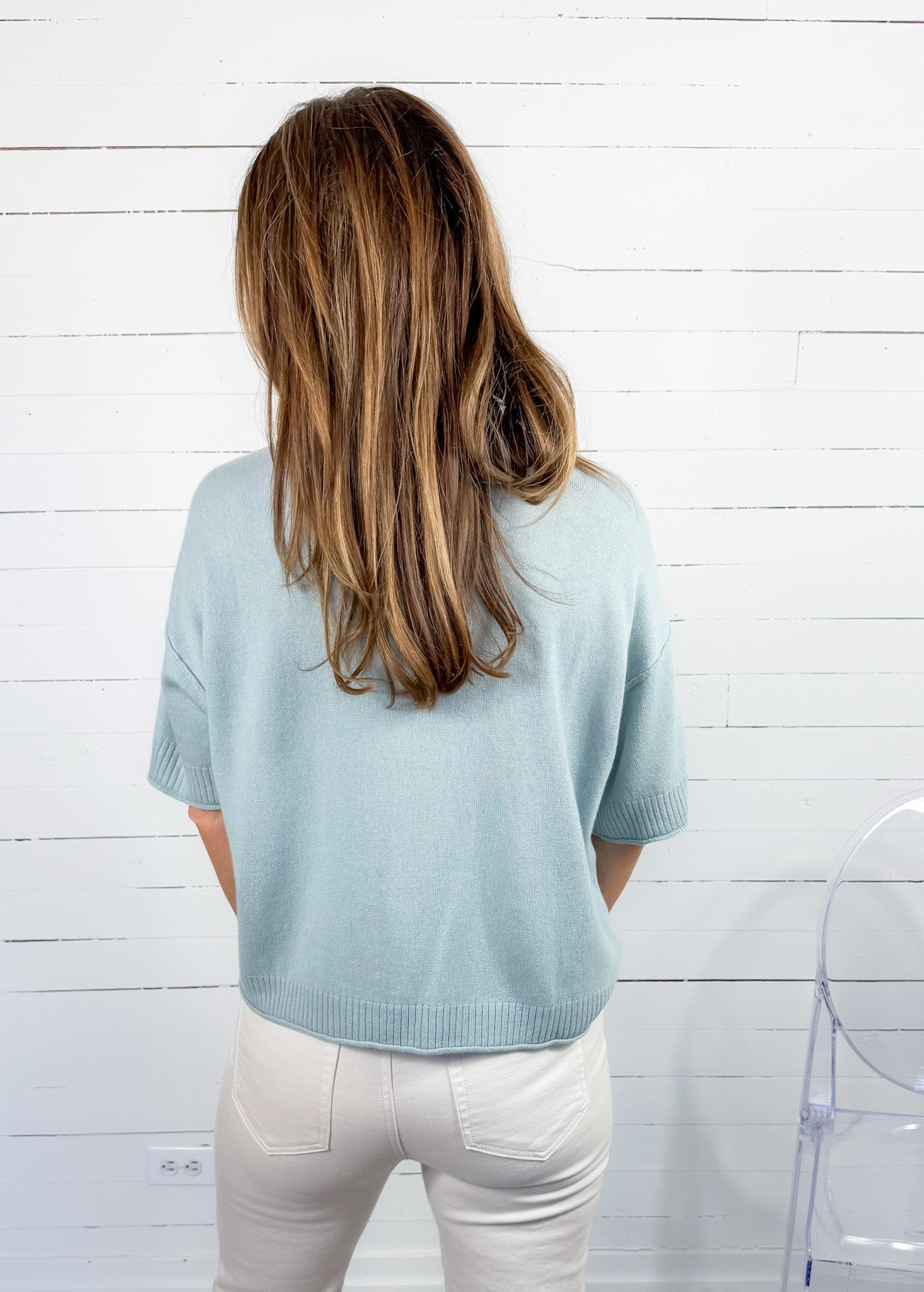 Meet the sweater that feels as good as it looks. Our Sacha Soft Mint Cashmere Blend Sweater is the definition of everyday luxury—lightweight, buttery soft, and designed in the dreamiest muted mint hue that flatters every skin tone. With a graceful short sleeve, relaxed drape, and elevated ribbed detailing at the sleeve and hem, this is the piece that makes style made simple feel effortless.