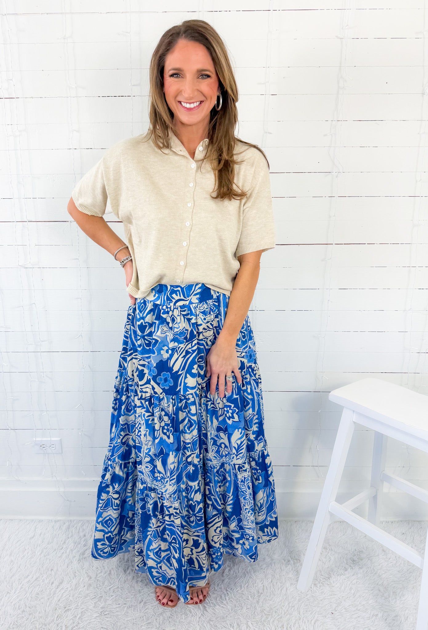 Bold, playful, and made for sunny plans, our Barnes Azure Maxi Skirt brings an instant getaway feel to your look! She’s the kind of piece that turns a simple outfit into a statement effortlessly! Barnes features a vibrant floral print throughout with a high-rise silhouette for a flattering fit, great tiered flow and easy versatility for styling with sweaters, tees or a chic blouse this season!