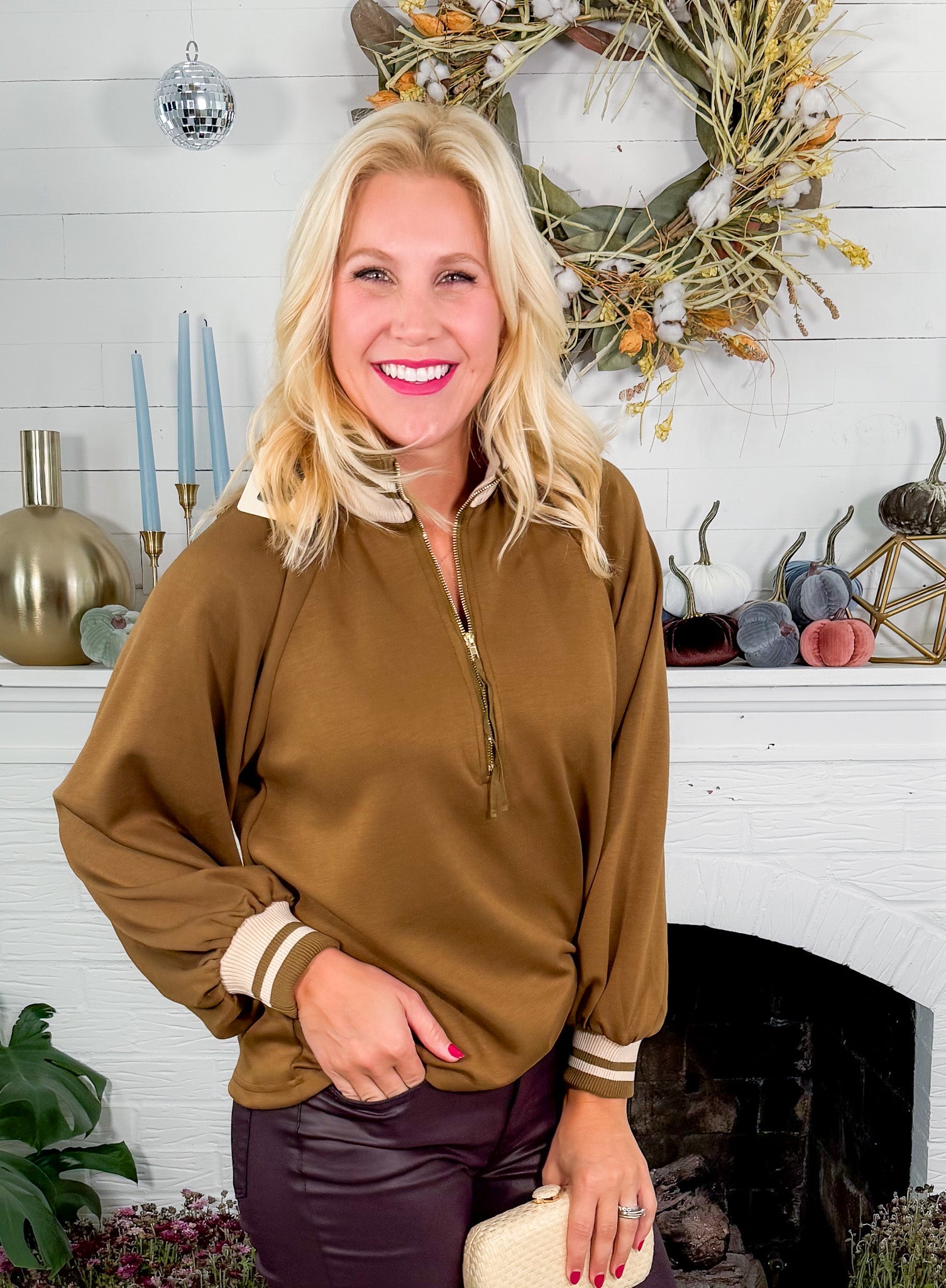 Look who's back ladies + this time in a long sleeve option! Our Gibbs Olive Knit Quarter Zip Top allows you to elevate your style without having to give up comfort! Gibbs features cozy olive green colored fabric with an accent trim that beautifully details her collar + charming long sleeves! And let's not forget the statement half-zip neckline that adds a modern touch to her design! Pair her with a chic skirt for an effortless Fall look, or go more classic casual with a blue jean denim bottom for your every day Fall look with Gibbs!