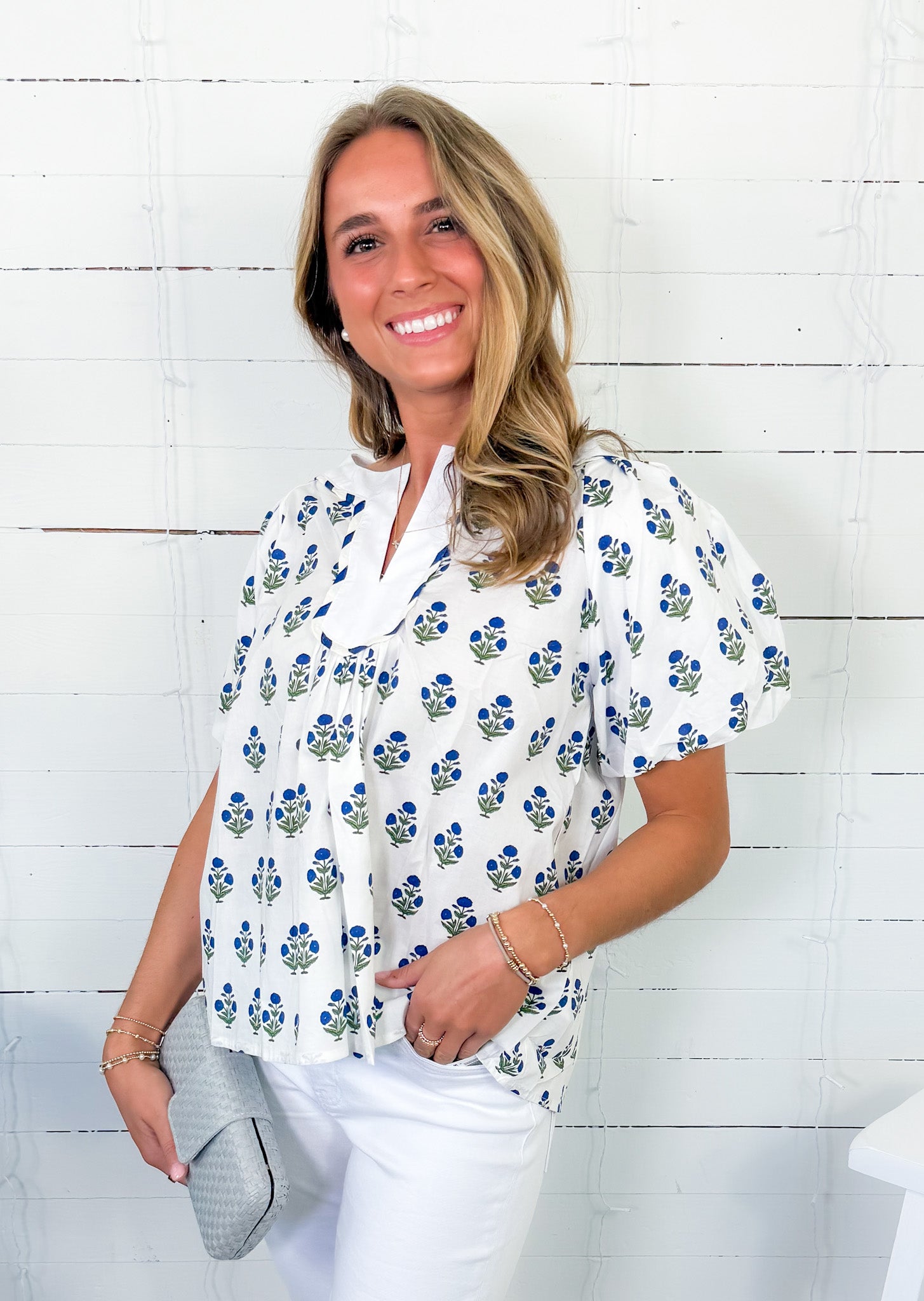Rose White + Blue Floral Top