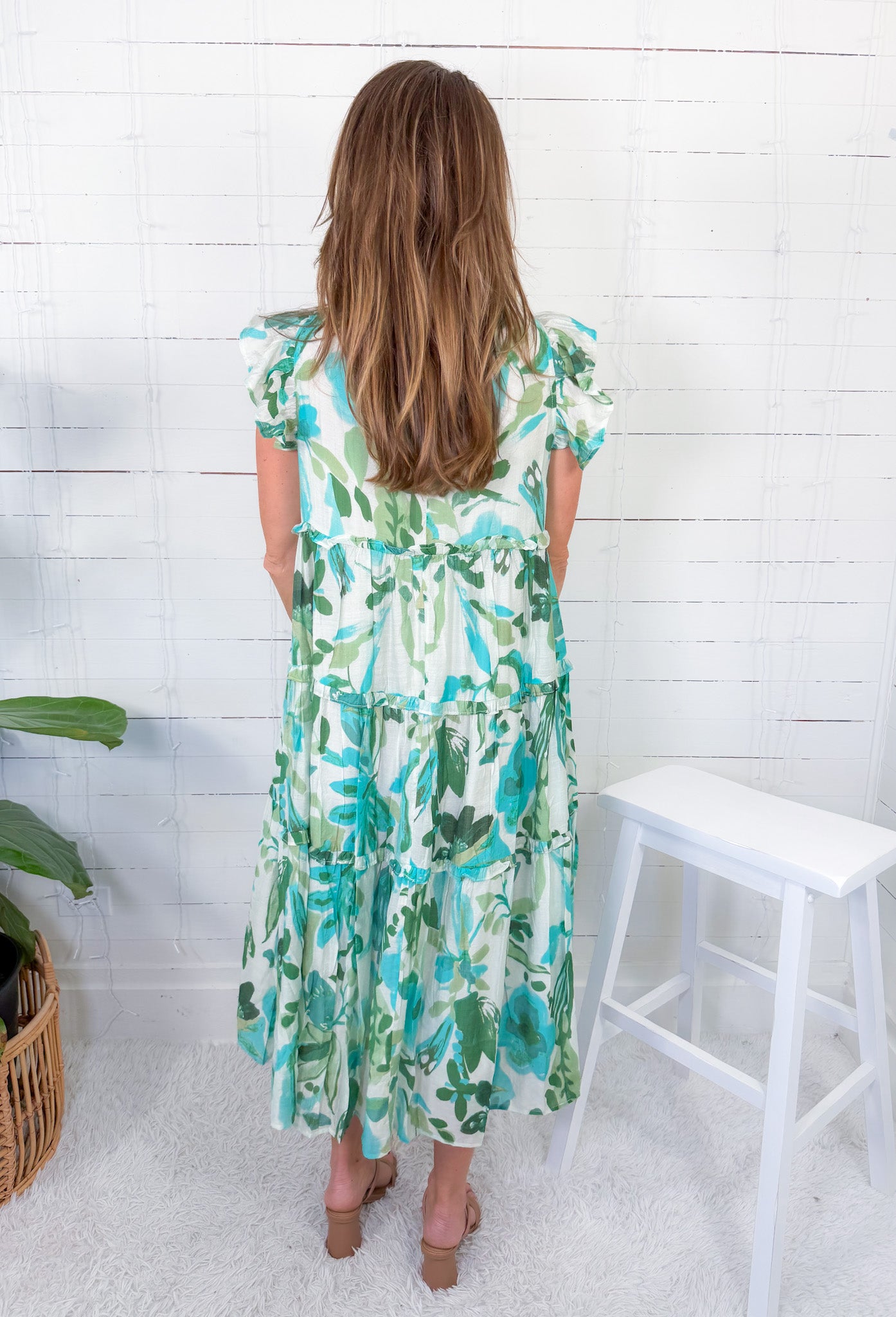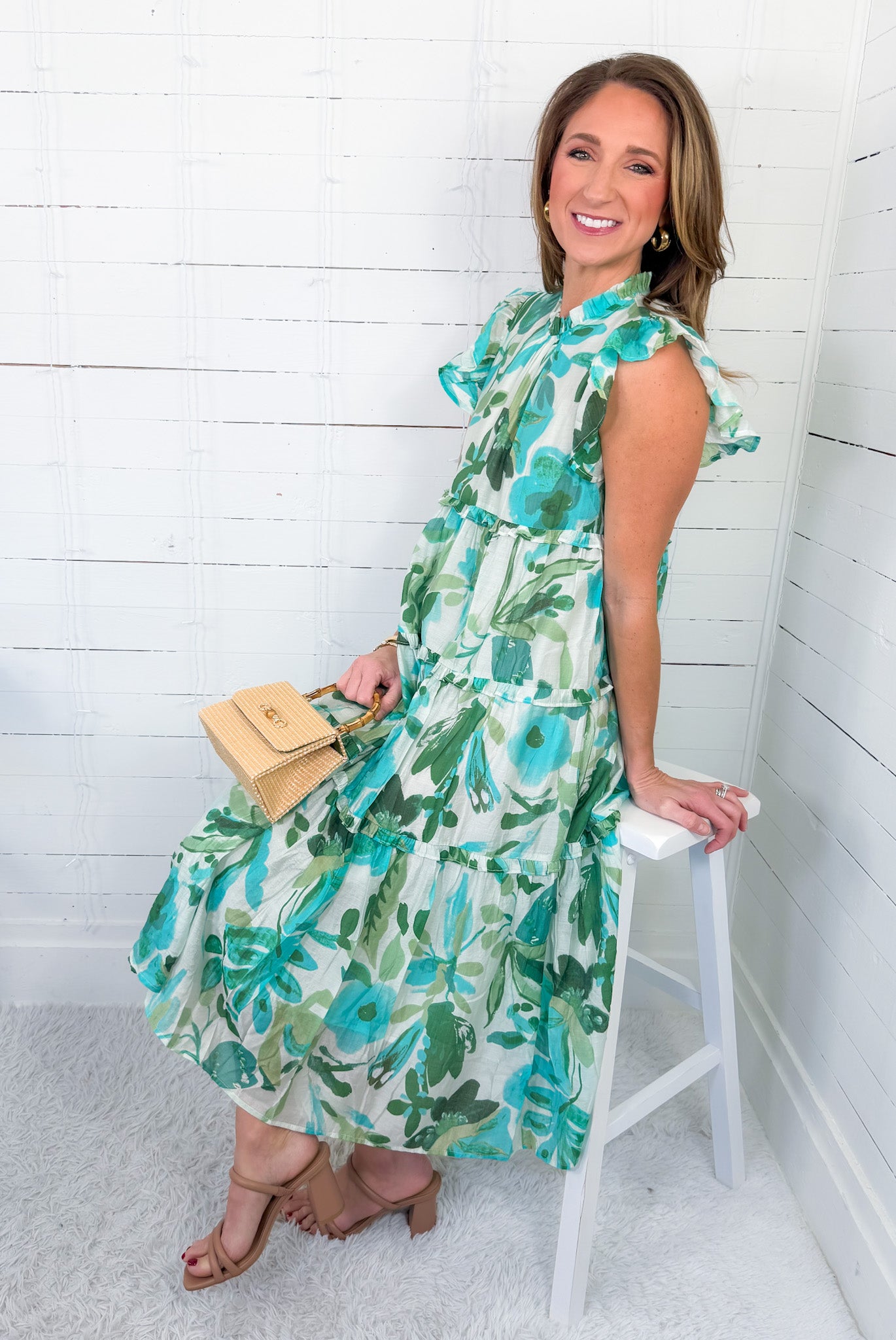 Our Vera Aqua Watercolor Floral Midi Dress is such a feminine beauty with her flowy shape + gorgeous watercolor print! Her flutter sleeves + tiered flow give it that effortless, relaxed touch you’ll love! Vera works well with ballet flats, sneakers or heels given her versatile nature - but we love her for all the upcoming spring special occasions (like weddings!) She won't last long, so make sure you snag this CUSTOMER FAVORITE style quick before she's gone!