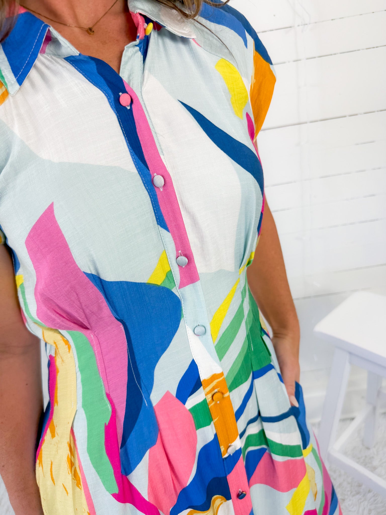 Make a statement this season with our stunning Opal Sky Mix Abstract Midi Dress! She perfectly balances bold style with feminine structure in her design + details! Opal features a full button down front for easy wear but her true highlight is the waistline, which includes defining pleats to create a flattering look every time! Style Opal with heels for a dressier look, or pair her with sneakers for a more casual look!