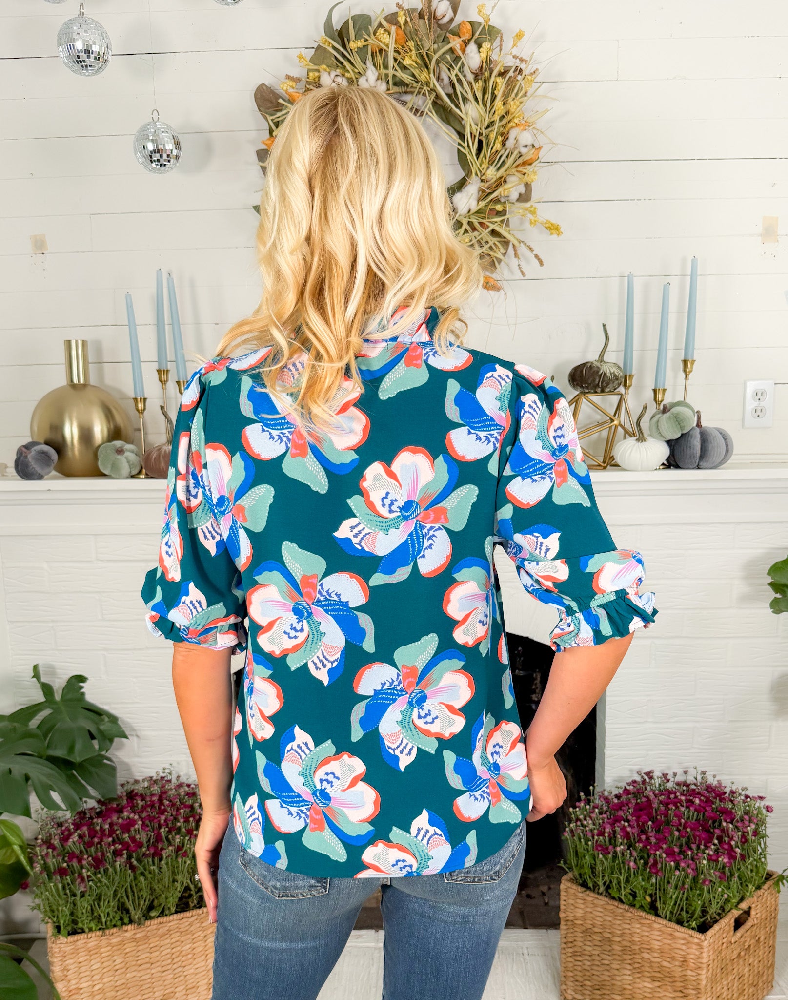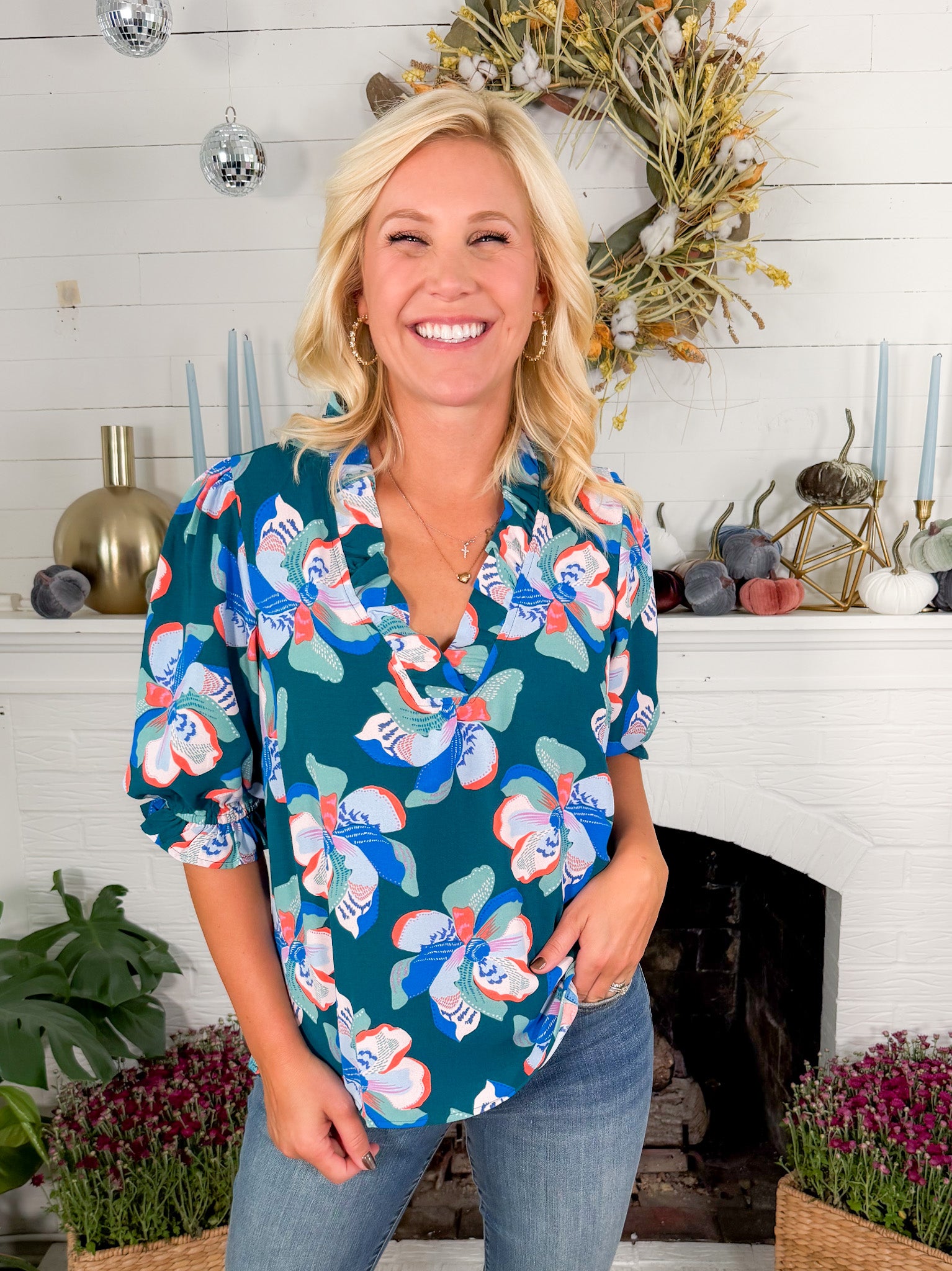 Our Julie Center Stage Green Top radiates elegance for your Fall wardrobe with her ruffle neckline, elbow-length sleeves + chic straight fit! Perfect for both casual outings + more formal occasions, Julie effortlessly blends feminine design elements with timeless style! Pair her with your favorite ecru jean + booties for an effortless Fall outfit that is sure to turn heads!