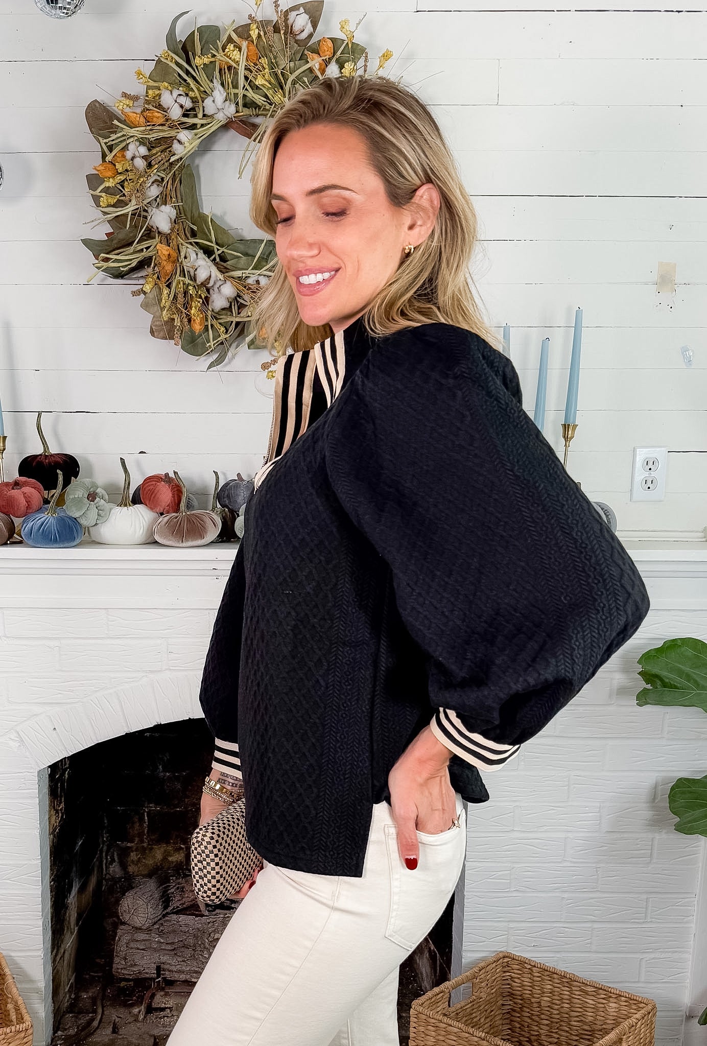 Elevate your casual wardrobe with our cozy Keeler Black Quarter Zip Top! She is a classic 1/4 zip top combining sporty + chic all wrapped into one! Her contrasting rib stripe trim along the zip neckline + cuffs adds a fresh, modern touch, while her textured knit fabric gives Keeler a cozy, comfortable feel! Great to pair with lounge pants, jeans or a cute Fall skort!