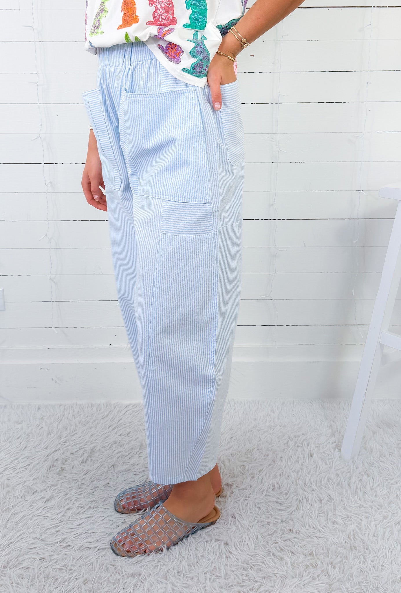 These striped barrel-like jeans are THE hit of the season - and we are LOVING them! Our Kimball Pale Blue Oxford Striped Pocket Pants feature a relaxed fit through the legs that tapers in at the ankles, creating a curved look, while her blue + white stripes offer a classic + versatile appeal to her design! Kimball's elastic waist + great stretch offers you a flexible + comfortable fit for all-day wear whether you're at the office, off to date night or racing against the kiddos to find the best prized eggs in the hunt!