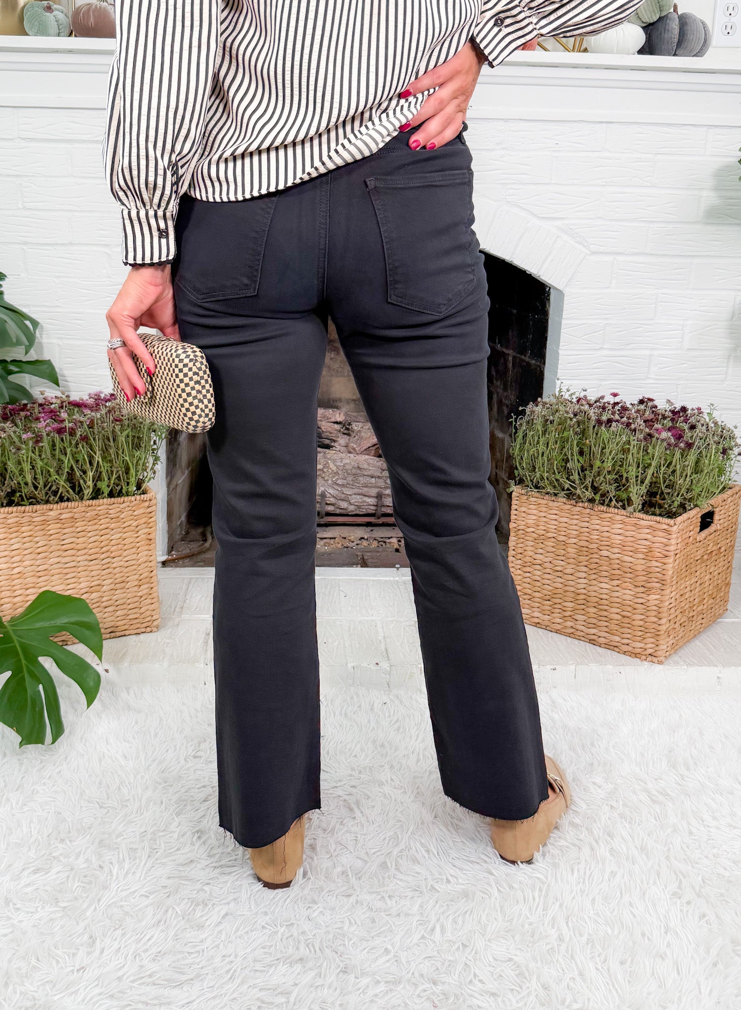 Every woman needs a chic black denim in her wardrobe - and these Kelsey Firm Black Ankle Flare Raw Hem Jeans are the perfect ones! Her stretchy black colored denim creates a perfect fit with a high-rise cut, belt loops, + classic five-pocket design! She also features figure-slimming pant legs that continue down to flared, raw-cut hems to allow versatility if you need to adjust her length!