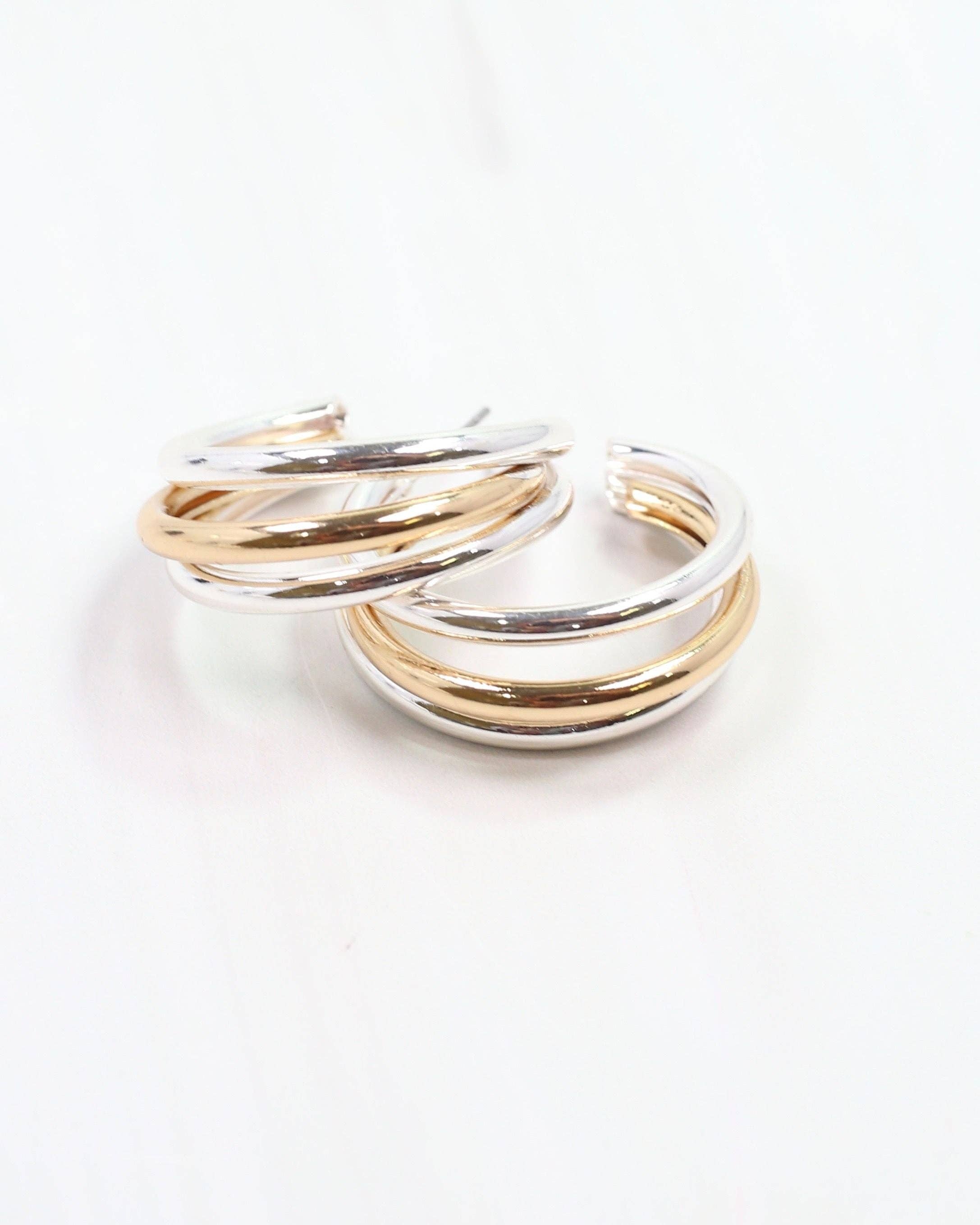Add a twist to your style with the Layla Hoop Earring in Gold and Silver! These playful triple hoops mix metals effortlessly, featuring shiny silver outer hoops framing a gleaming gold hoop in the middle. Lightweight and fun, they’re perfect for adding a little sparkle and a lot of personality to any outfit.