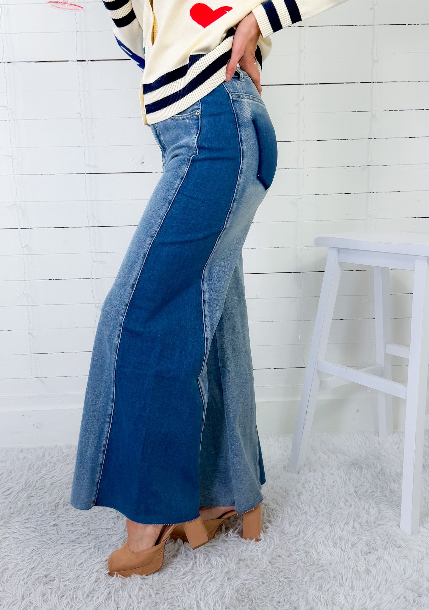 When we say you NEED these jeans, you REALLY need these jeans! Our Long Beach Two Tone Jean is a statement-making wide-leg denim that is designed with bold contrast side panels for a modern western edge that is sure to turn heads! Her mid-rise silhouette offers a structured yet comfortable fit, finished with a lived-in wash that pairs effortlessly with knits, tees, or an iconic cardigan! A standout staple that brings character to everyday styling, you definitely need to add these beauties to your wardrobe!