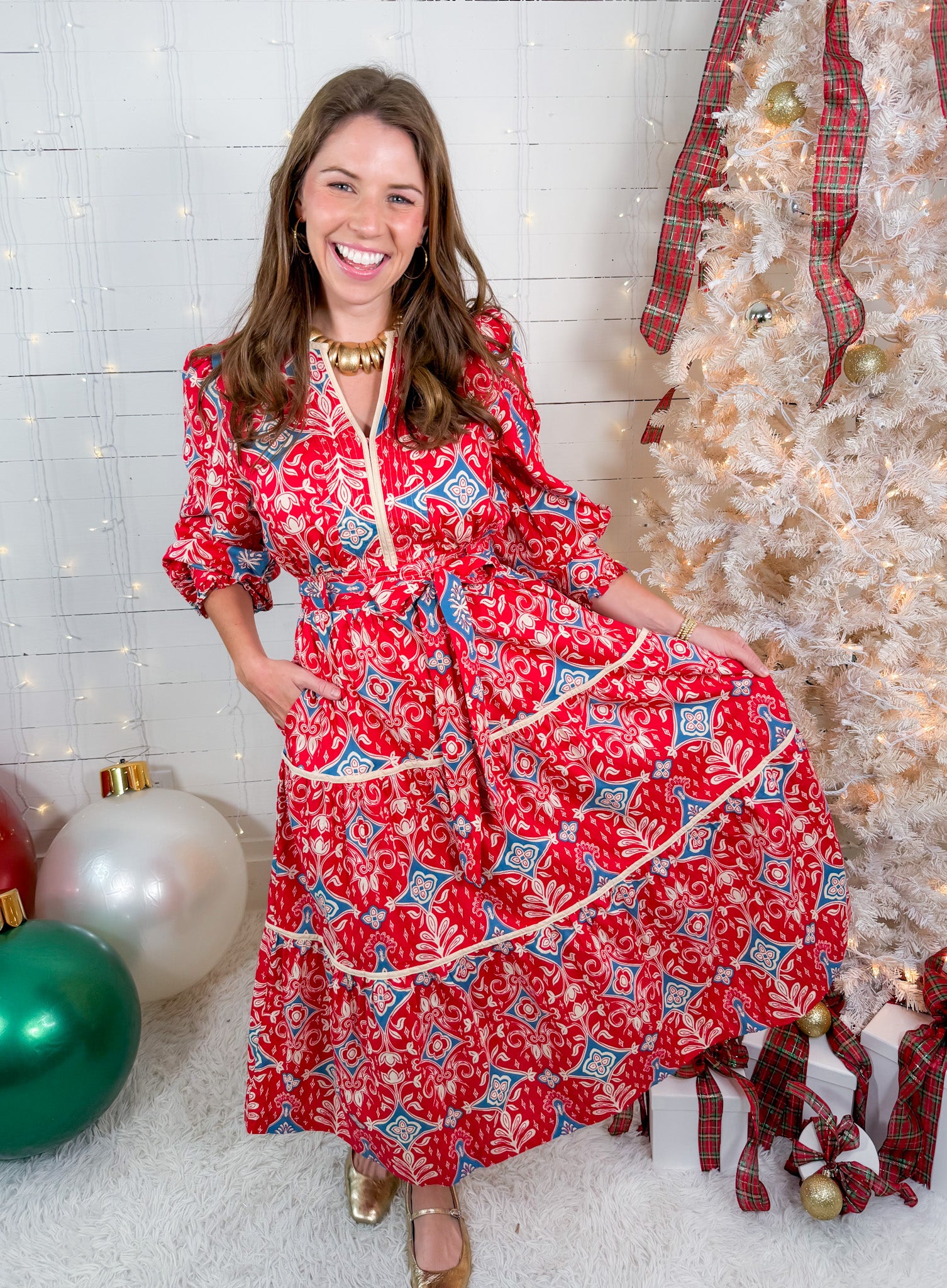Turn heads this Holiday season in our gorgeous NEW Devon Berry Red Maxi Dress! She is a playful blend of elegant detail + flirty charm! Her all over ornament-like print brings Holiday vibes to life, while her belted waist highlights your silhouette perfectly! Easy to dress up or down, Devon is your new go-to for breezy elegance all season long!