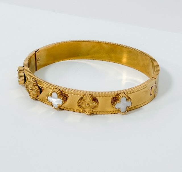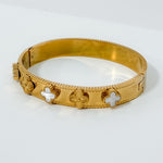Description: 18K gold plated stainless steel hinged bangle bracelet