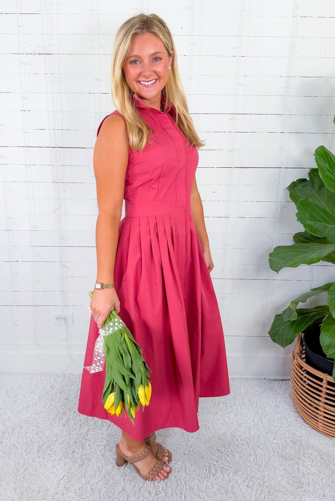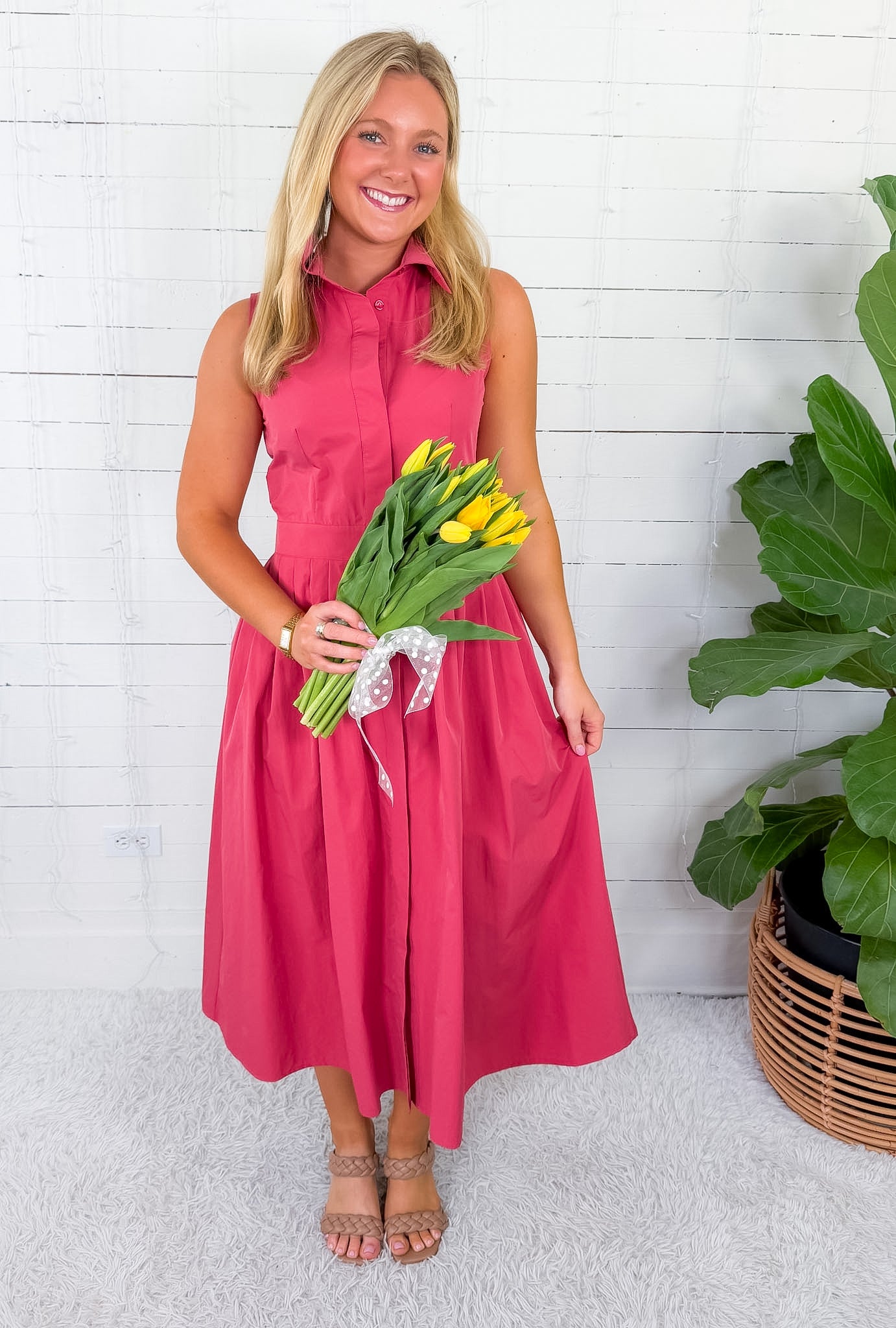 Crisp + effortlessly chic, our Elaine Raspberry Shirt Dress is sure to be a crowd favorite this season! She features a gorgeous raspberry colored poplin in a structured yet breathable feel that is sure to keep things stylish + cool for you! With a classic collar that transitions into a clean button down neckline, Elaine gives a modern twist on a traditional silhouette! Easy to style with sneakers or sandals + your favorite springtime jewels to bring your chic Spring look all together!