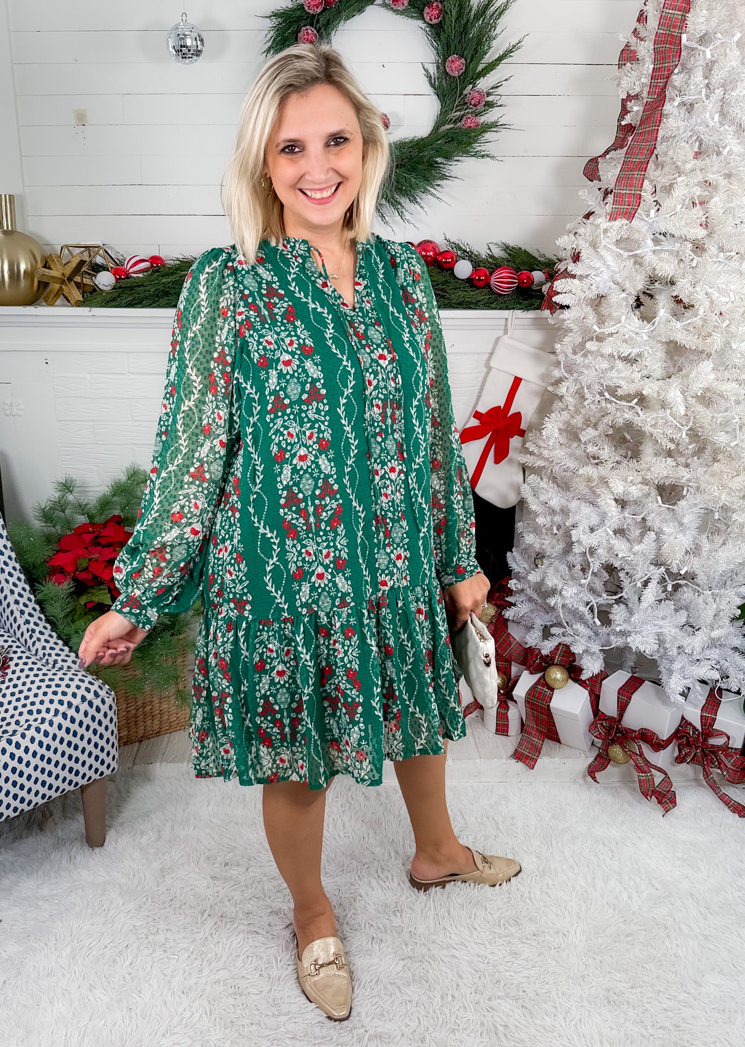 Deck the Halls - this dress has it ALL! Our Natasha Ivy Lane Green Mini Dress is where classic design meets festive flair! With her flattering long sleeves + a stylish double placket, Natasha brings sophistication to every look! Her collar band with adjustable ties adds a chic, customizable detail, while her tiered hem flows beautifully for a flattering silhouette every time! Easy to pair back with your favorite heels or ballet flats + jewels to complete your show-stopping look with Natasha!