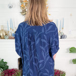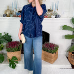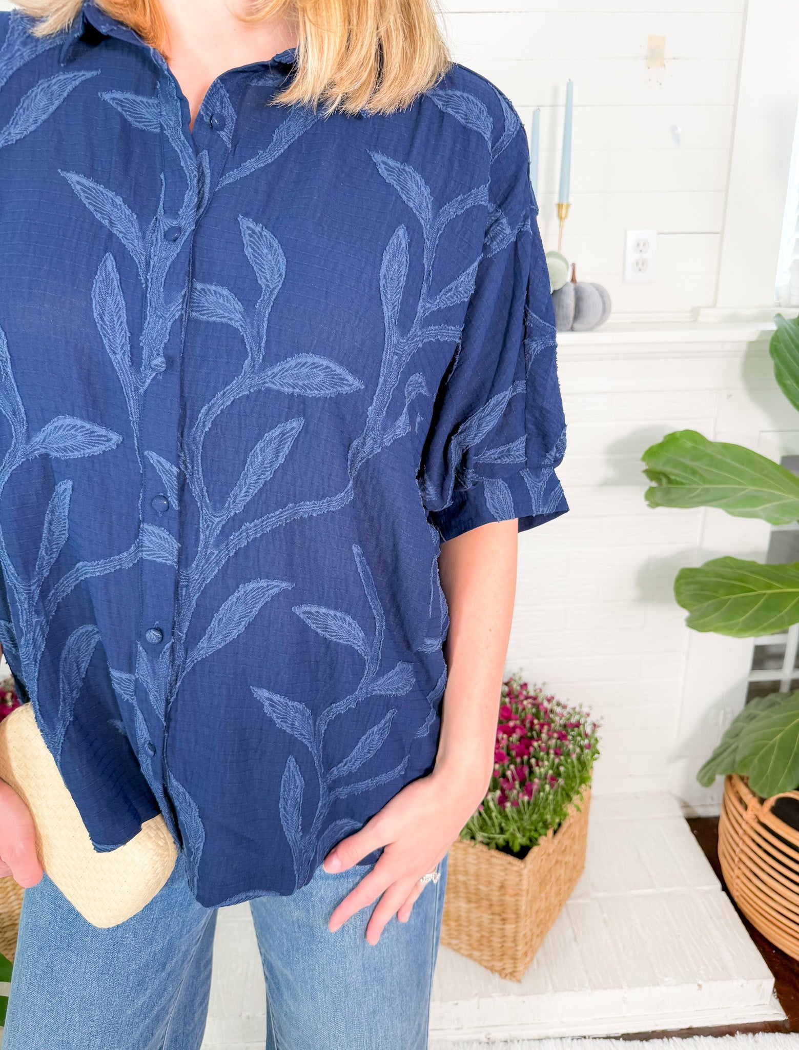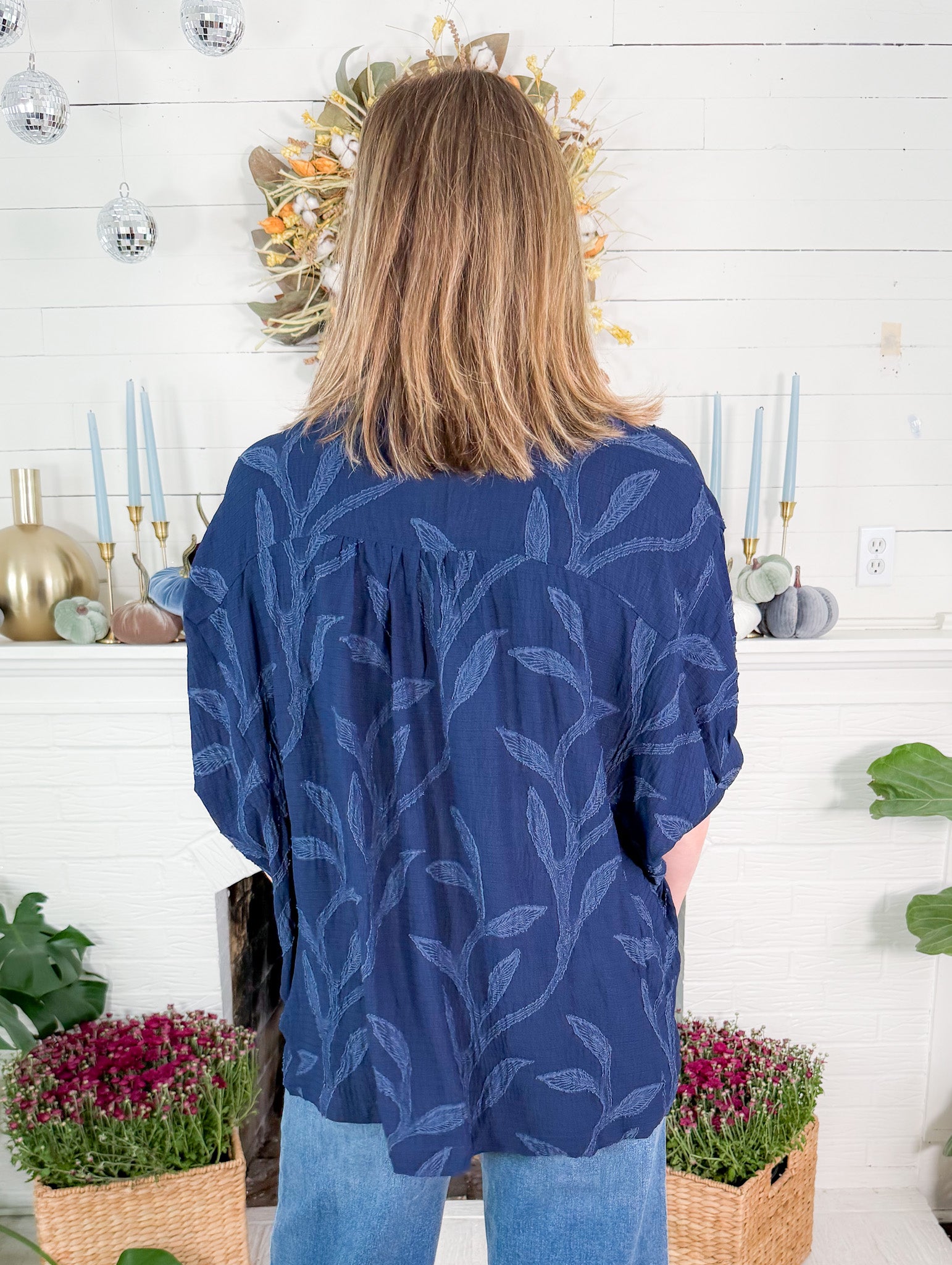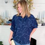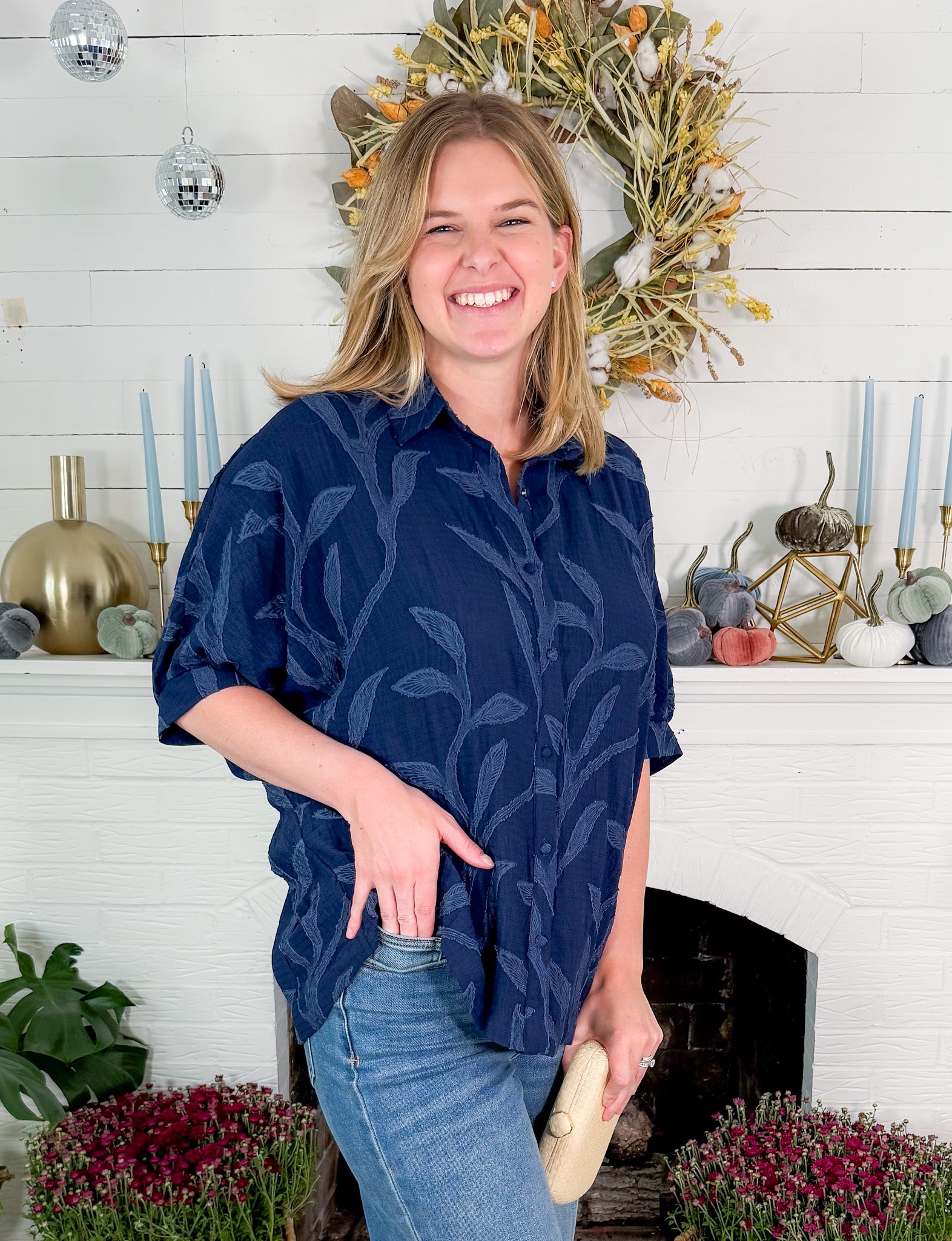 A TOP notch top for your Fall wardrobe has arrived! Our Nelson Navy Button Front Top features a beautiful navy hue body, leaf detail throughout, easy button down style and a breezy fit! Great for pairing with your favorite ecru jeans from Clover + Bee + some fun little booties! You're sure to love Nelson as much as we do - just wait!