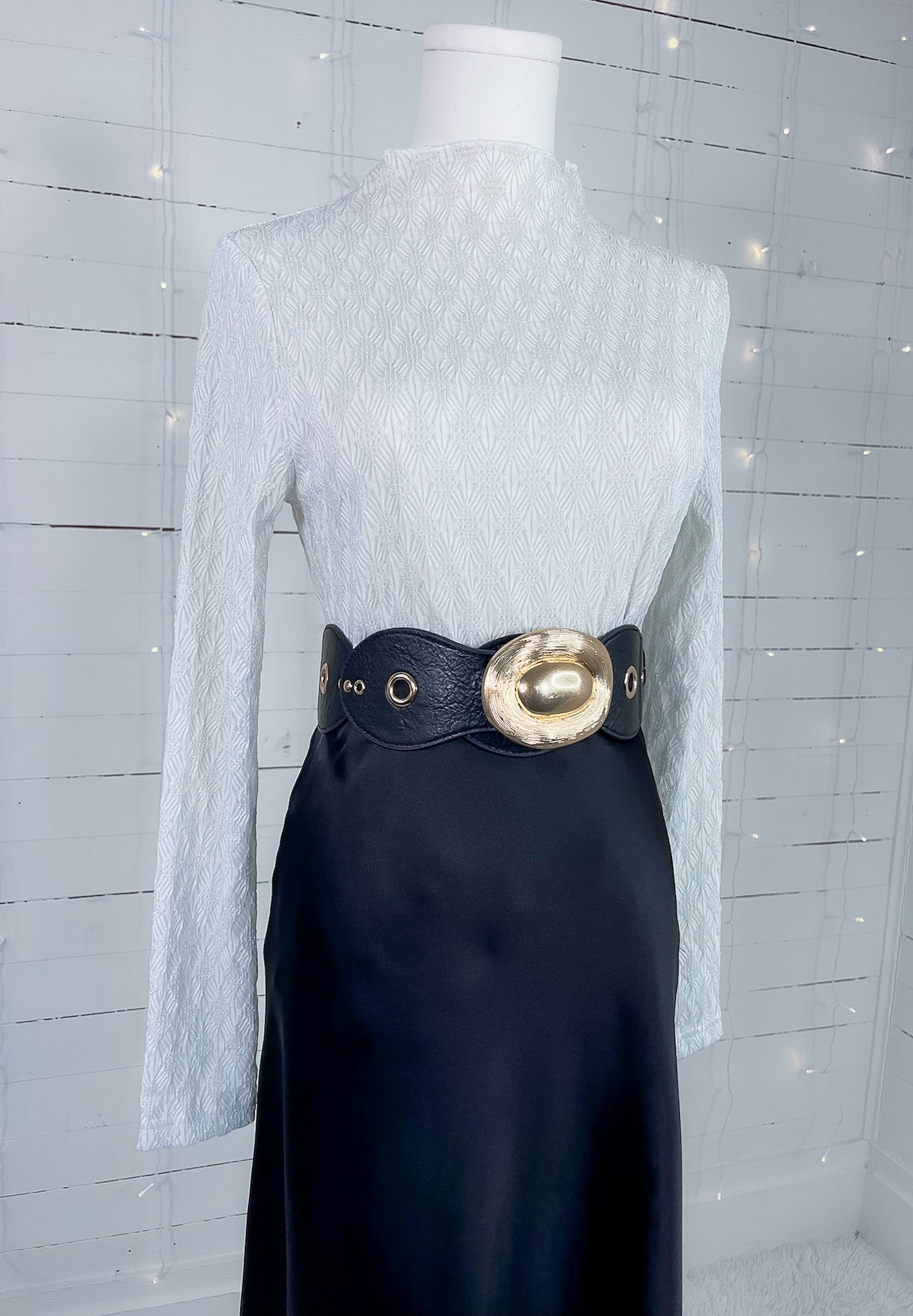 Elevate any outfit with our gorgeous NEW belt, the Palisades Gold Buckle Black Stretch Back Belt! She features an elastic band that stretches around effortlessly, gold oval buckle and great versatility for any outfit you are looking to upgrade!