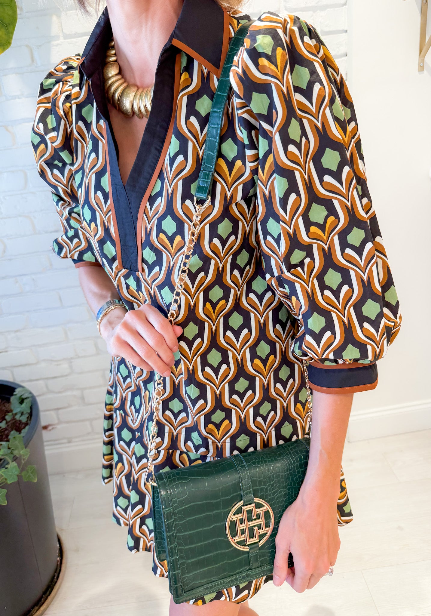 You're sure to FALL in love with Pawley Black Geometric Mini Dress - just like we have! She features a neutral toned geometric pattern throughout that gives her lots of Fall flair, playful flounce hem + a bold contrast spread collar, making her perfect for the season! Toss on some booties + some great statement jewels to complement her flair, and you'll be good to go take on all the adventures of Autumn!