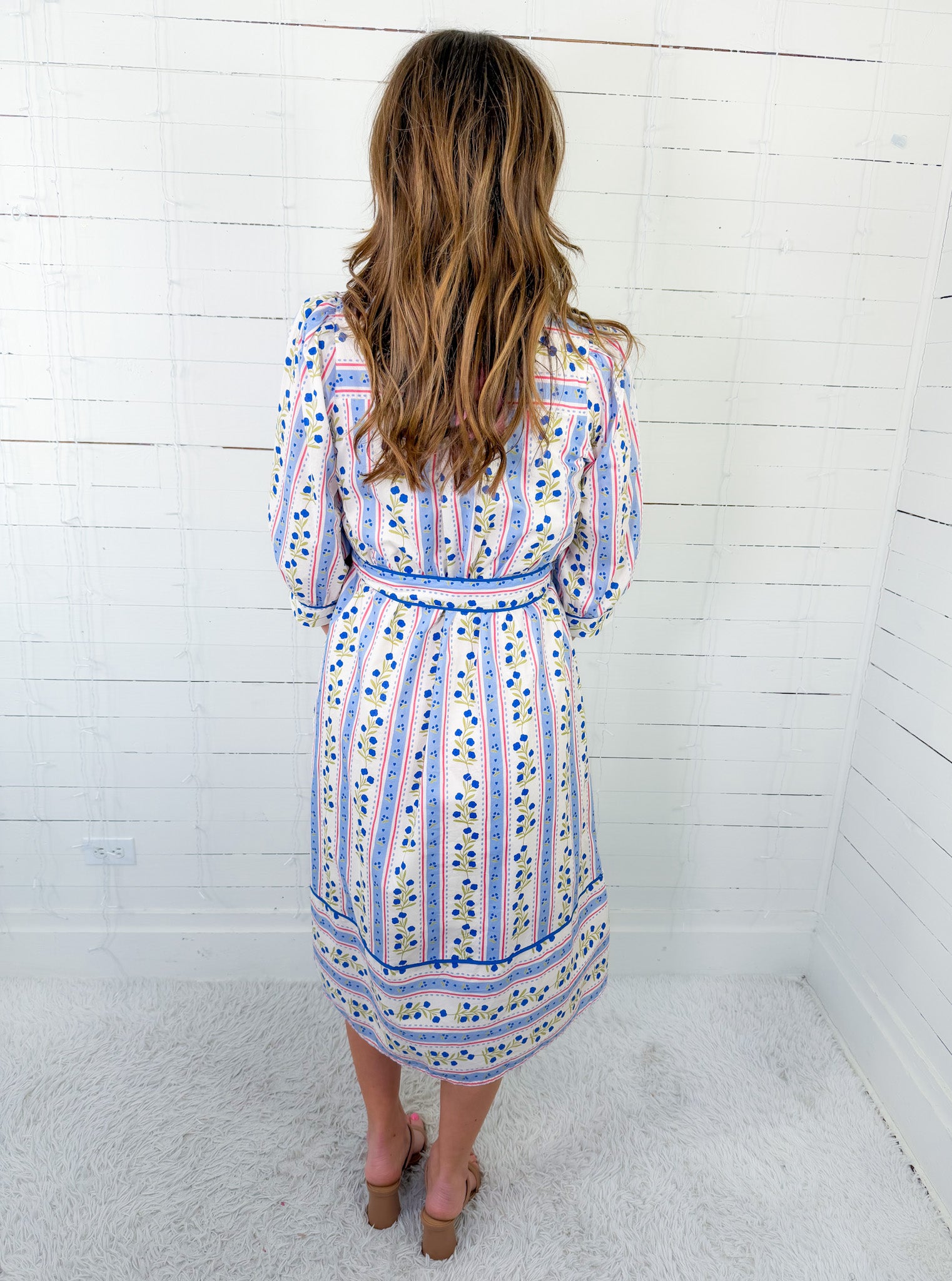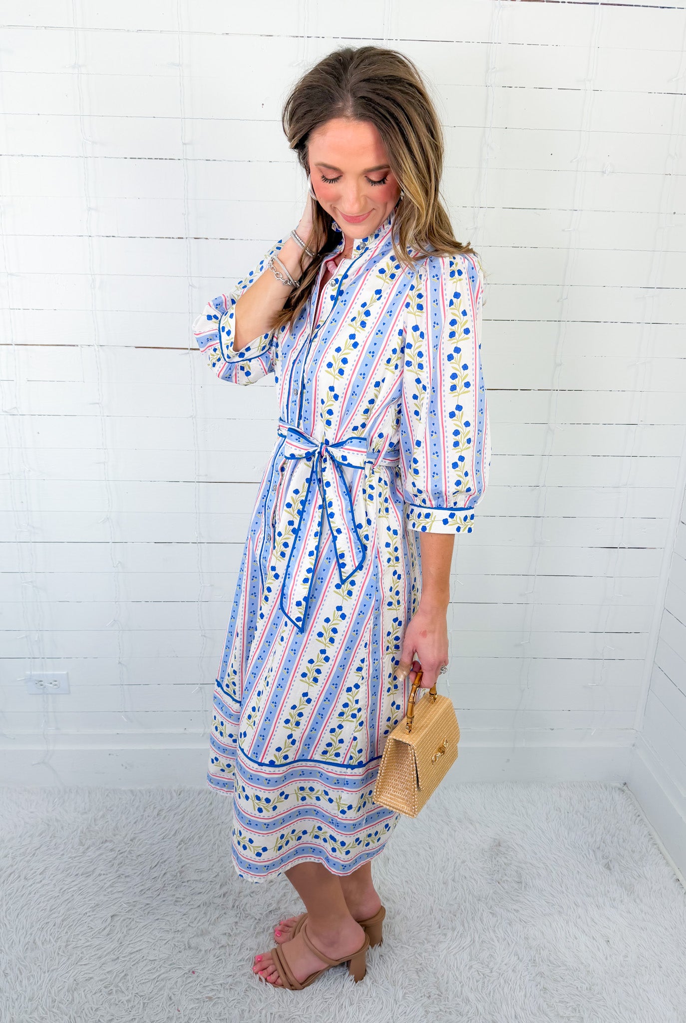 Make a joyful impression this season in our captivating Percy Blue Floral Maxi Dress! She features a stunning blue floral print paired with a charming ruffle collar + intricate striped design details that elevates Percy to the max! Her button down design + shirt dress construction creates a dynamic, flattering silhouette that celebrates playful style without compromising on sophistication! And let's not forget her removable waist sash that can give you a whole other look with just one bow! Add heels + statement earrings to your mix and you'll be turning heads all season!