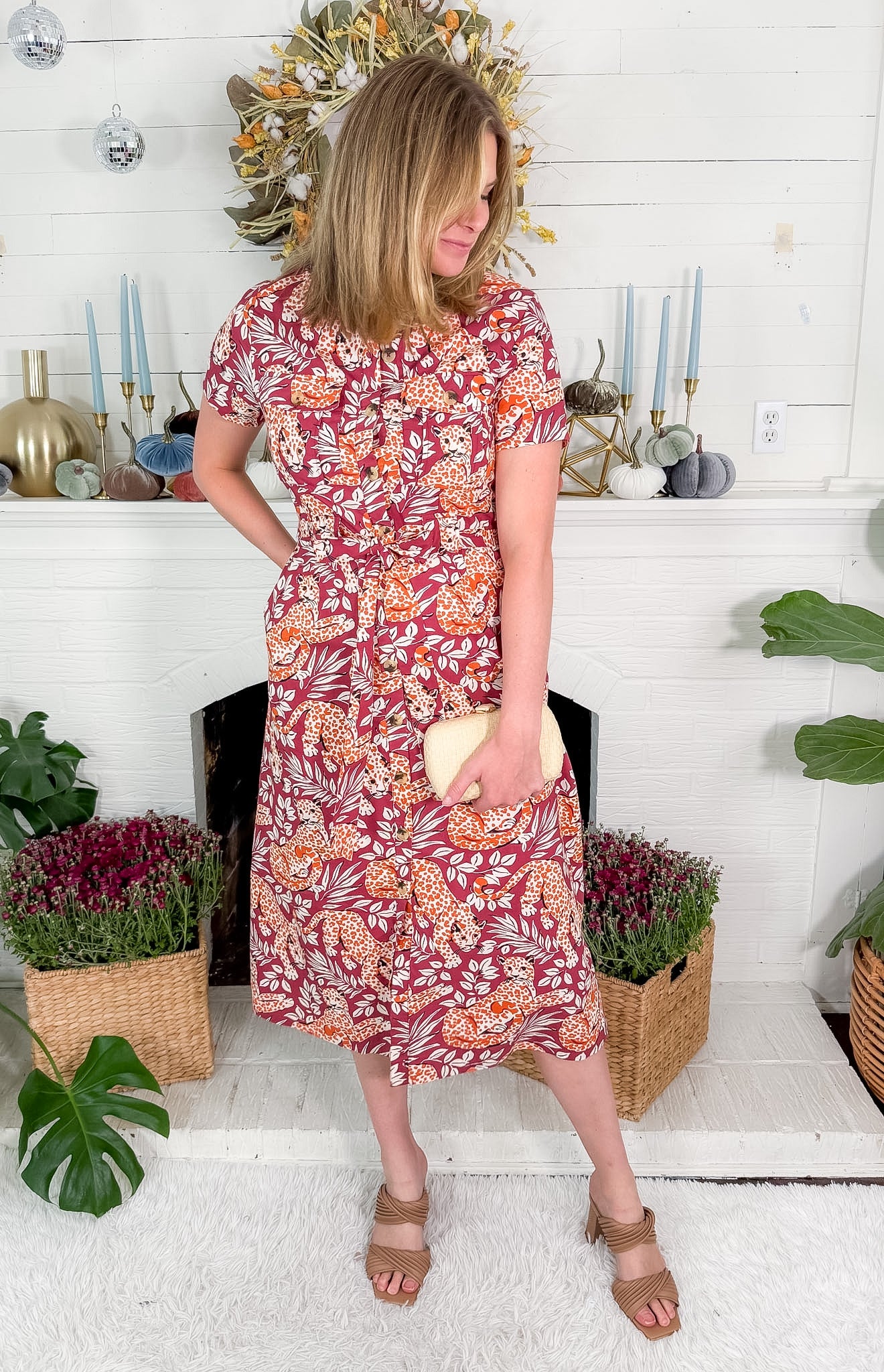 Our Juliette Maroon City Cats Maxi Dress is sure to make a statement in your wardrobe with her spotted leopards + tropical foliage this Fall! She channels effortless cool, with a fitted bodice, button-front styling, and relaxed boho silhouette! Juliette's ready for all the Fall adventures, just add booties + a little PSL to complete your effortless Fall look with Juliette!