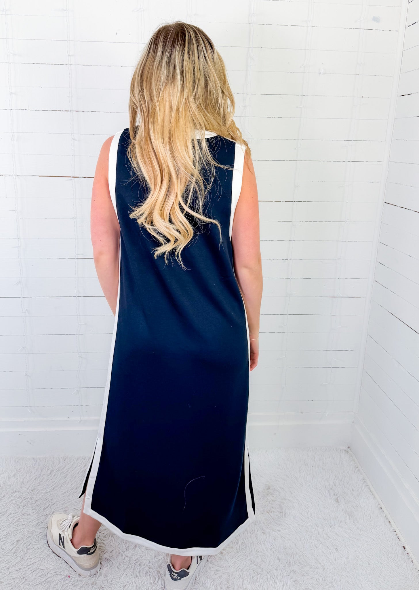 Get ready to be on the GO in style with our Quick Navy + White Sleeveless Maxi Dress! She is made for everything simple errand mornings, weekend plans, and all the moments that make up your day! Quick features a crew neckline, sleeveless design, side hem slits, white stripe detail down the side, relaxed fit, ultra-soft modal fabric, and functional pockets! She’s an easy, thoughtful choice when you want to feel relaxed but still pulled together!