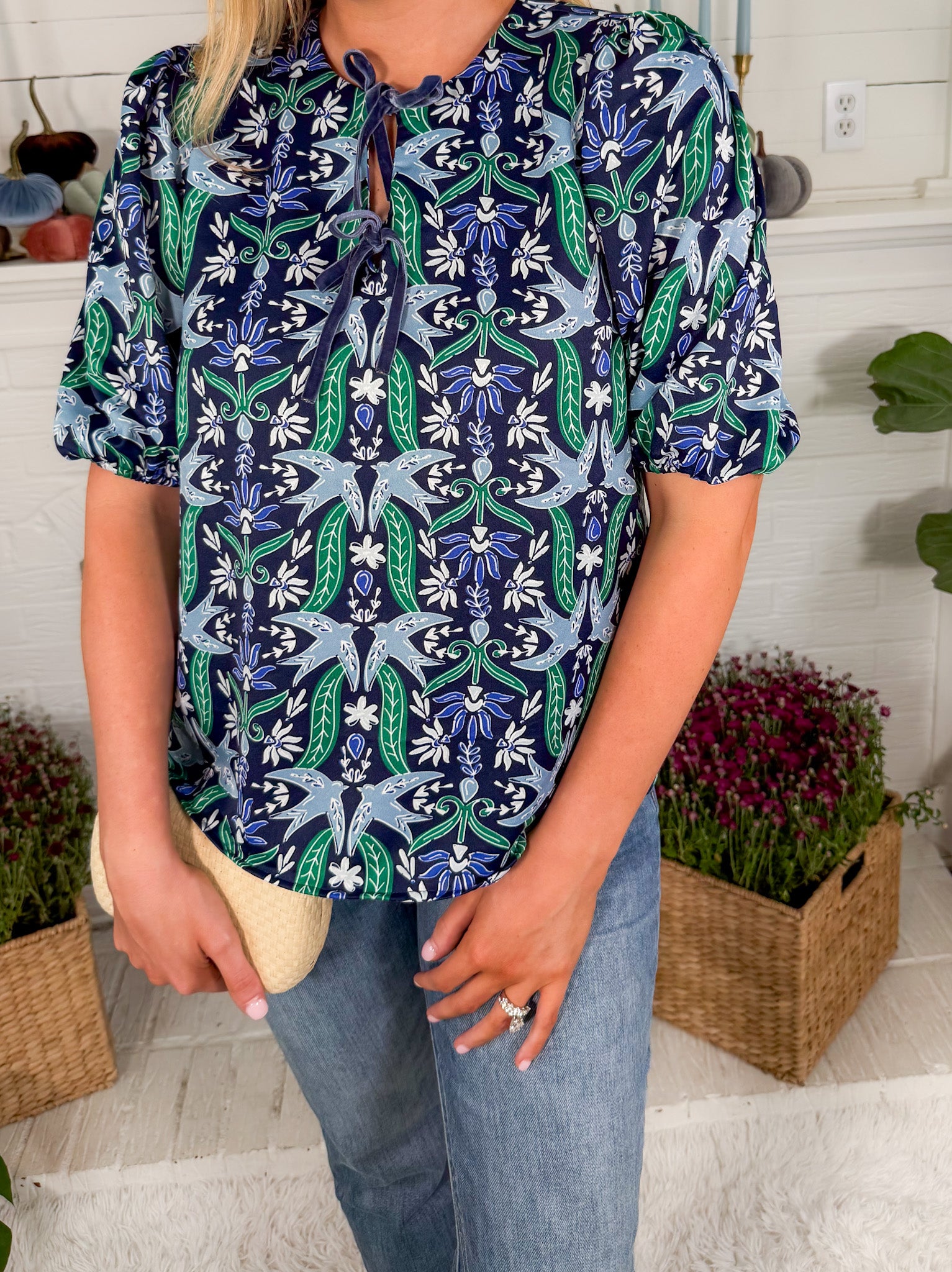 Icy blue hues for Fall? YES PLEASE! Our Ren Navy Gossamer Wings Top offers a modern twist on feminine elegance! She features short puff sleeves with elastic cuffs + delicate velvet tie details, tailoring down into a flattering straight fit! Effortlessly stylish, Ren pairs beautifully with everything from jeans to skirts + goes from day job to night socials without hesitation!