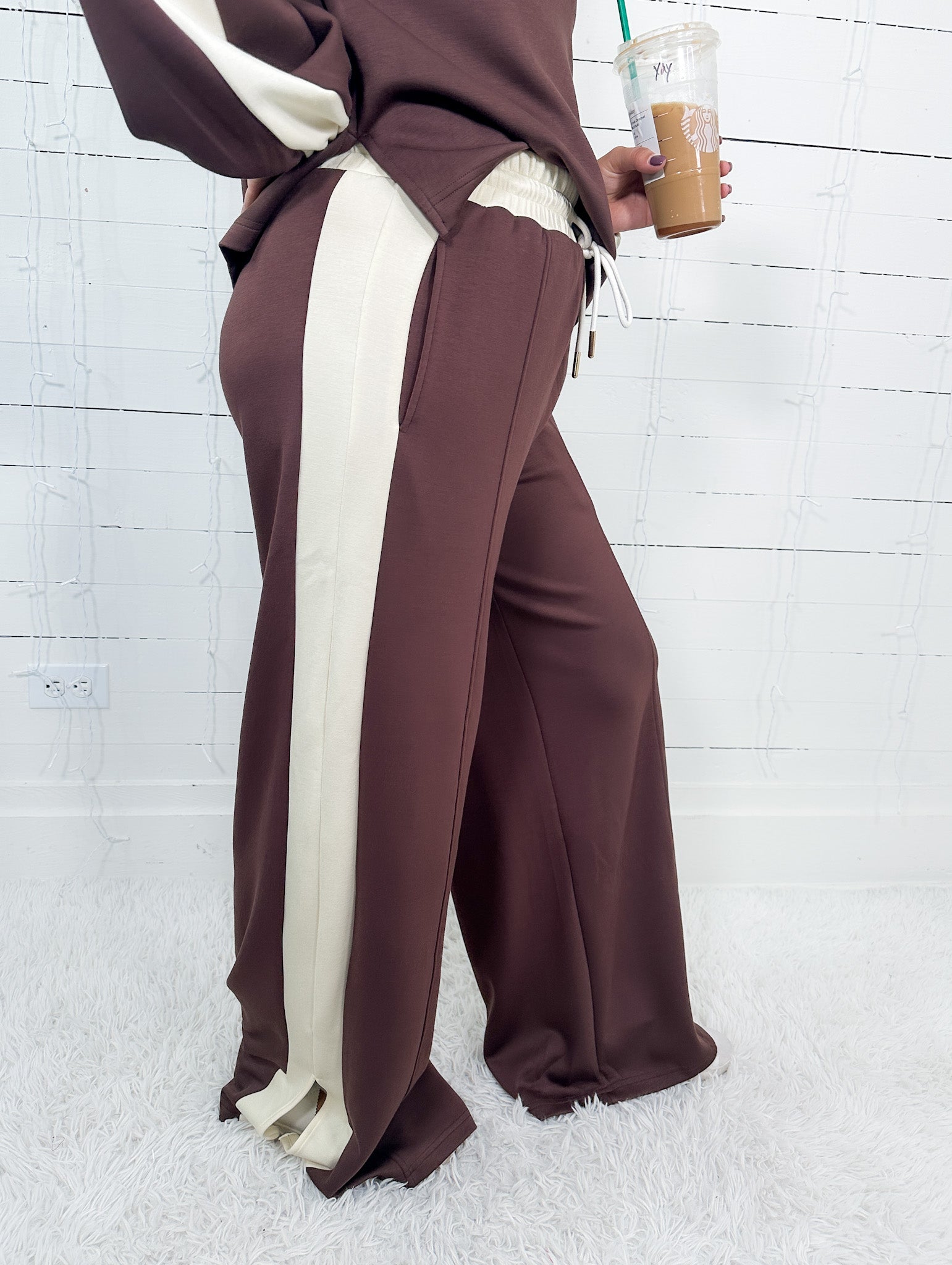 Talk about your ultimate comfort set! Our Roswell Brown Scuba Pants bring comfort + style together with a modern, sporty twist! She features a relaxed wide-leg silhouette, designed with a bold side panel contrast in ivory against a rich brown base! Her elastic drawstring waistband ensures a secure + customizable fit, while her soft scuba fabric offers all-day comfort! Perfect for pairing with sneakers + a casual top, these pants are your go-to for an effortlessly cool look!
