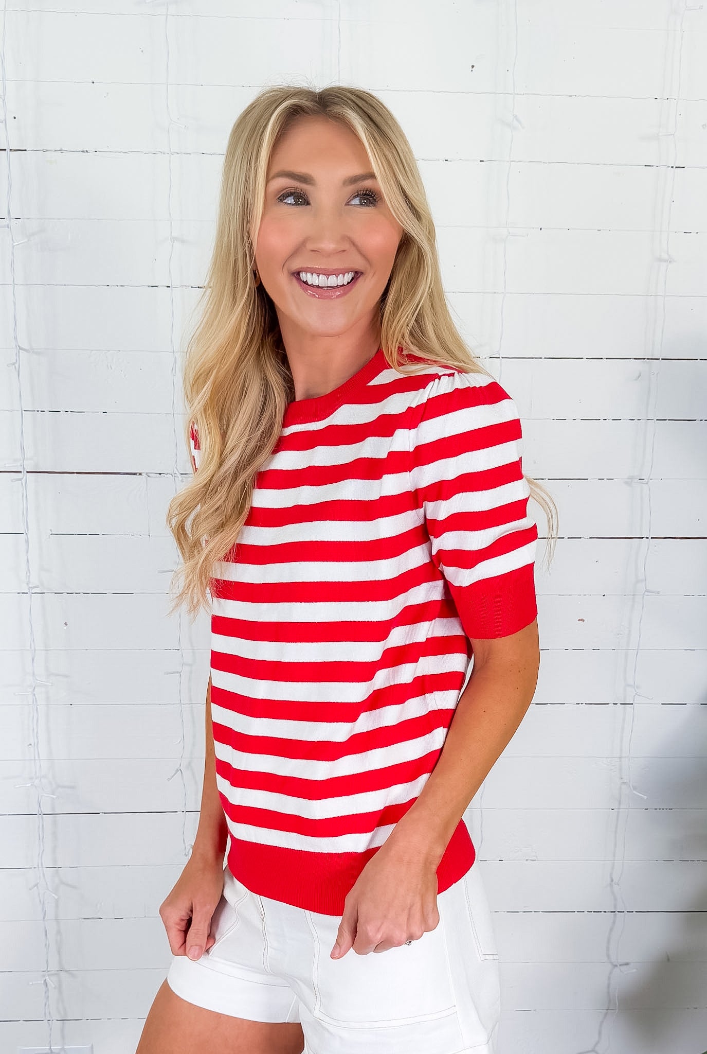 Easy, fresh, and full of charm! Our Bates Classic Red Stripe Sweater is your go-to for effortless everyday style! She features bold red stripes against a white base, bringing just the right amount of playful color to your warm-weather wardrobe! Her classic crew neckline + short sleeves keep her timeless, while her effortless style makes her perfect for pairing with denim bottoms or skirts!