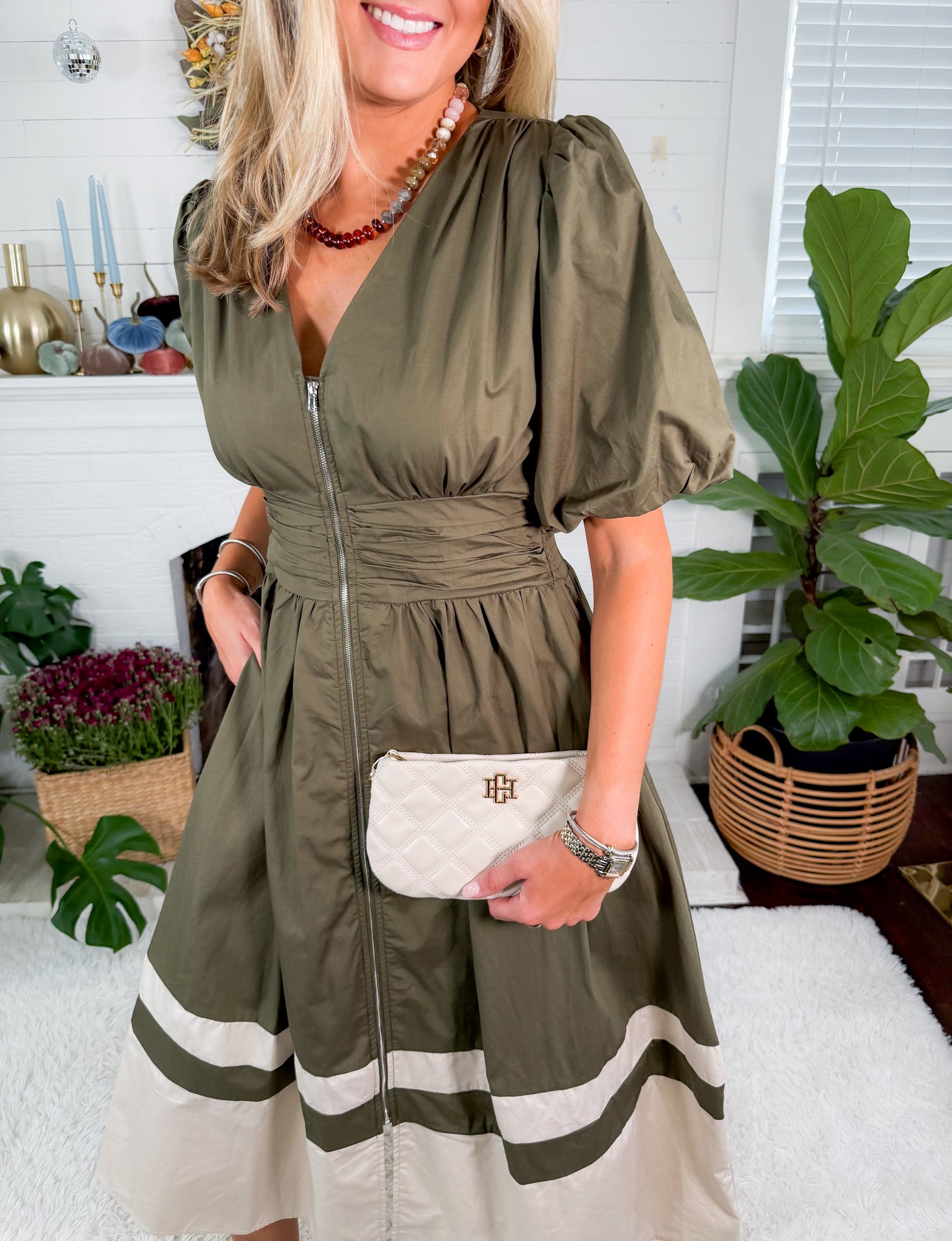 An Autumn classic that is sure to be your NEW favorite! Our Miranda Olive Zip Front Maxi Dress is a piece that features all the best things - autumn hues, trendy zip front, shapely silhouette and great versatility for all occasions! Perfect for Fall family photos, picnics in the park with the crew or even brunch with the gals! Add booties or sneakers with a fun beaded necklace to complete your classic Autumn look with Miranda!