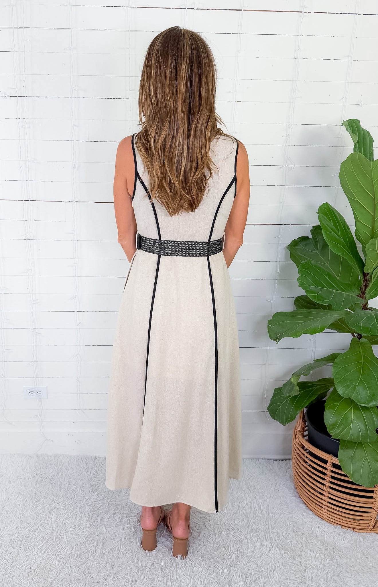 Virginia Natural + Black Trim Belted Linen Maxi Dress